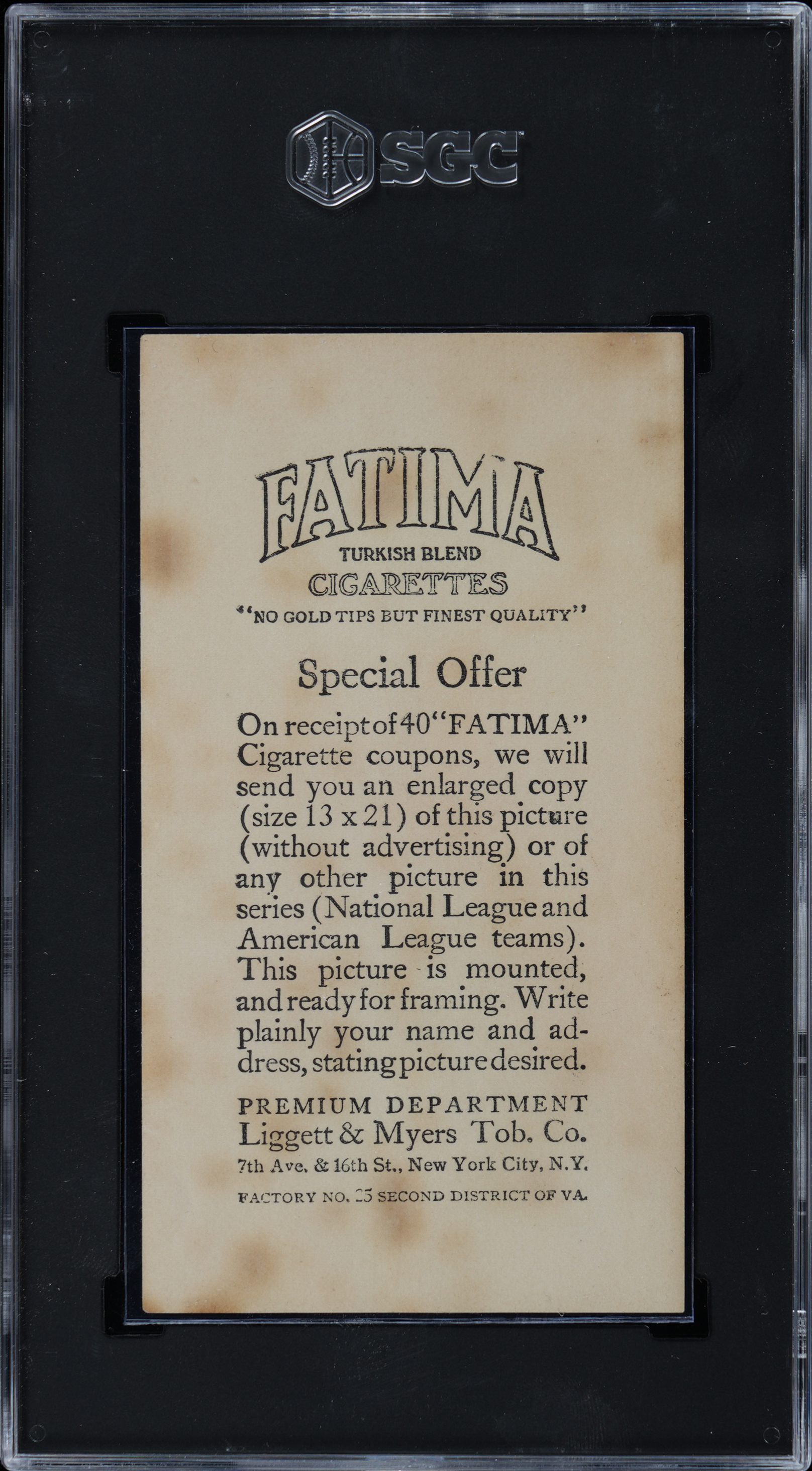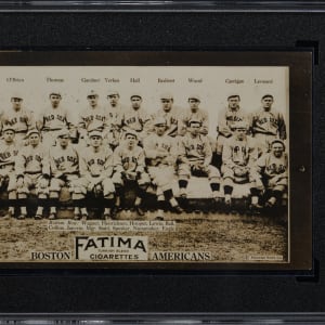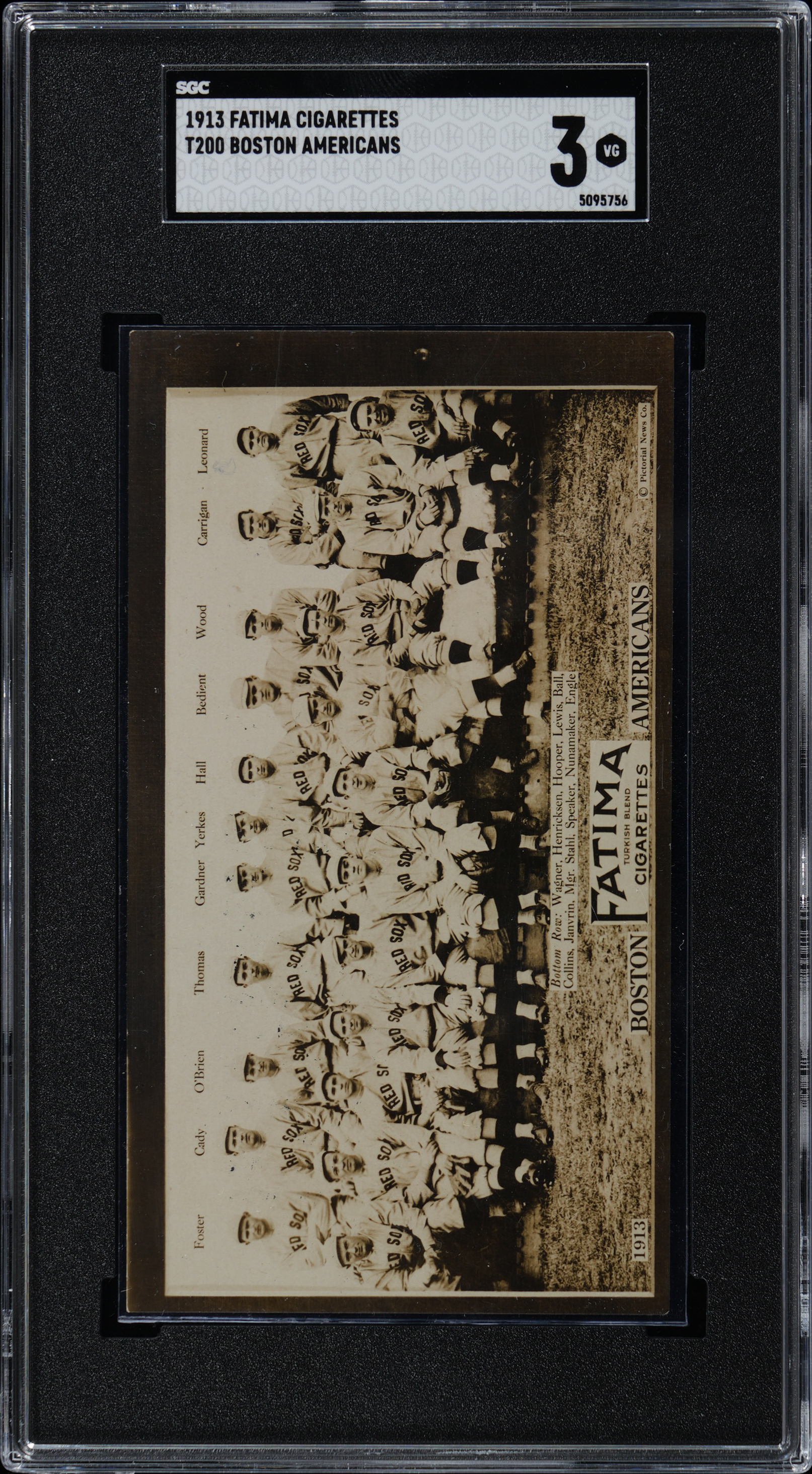 Graded VG 3 by SGC. The offered 1913 T200 Fatima Cigarettes Boston Americans Team Card comes from a SGC graded near set "break" offered individually throughout this auction. Hall of Famers include Harry Hooper and Tris Speaker.
