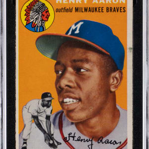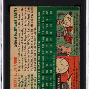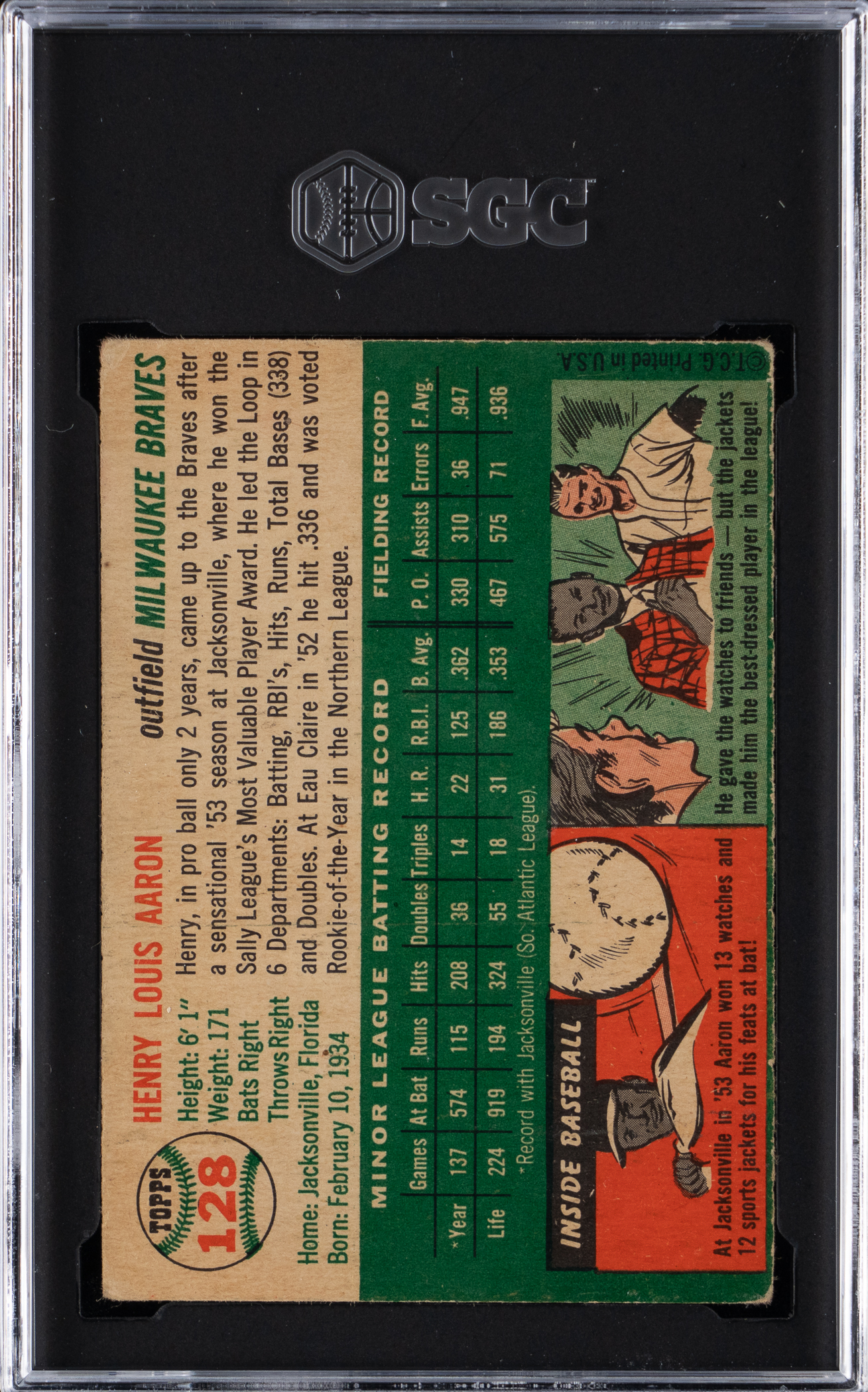 Graded VG 3 by SGC. Crown your 1950s Topps collection with the offered 1954 Topps #128 Hank Aaron rookie card. This foundational piece of the Milwaukee Braves Hall of Famer displays only moderate corner wear consistent with its overall evaluation along with a stray print line near the upper middle edge. The dual action/portrait pose displays intense player/uniform accents and the reverse is problem-free. A prime "Hammerin' Hank" to fill a significant void in your 1954 Topps set project!