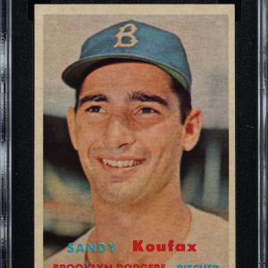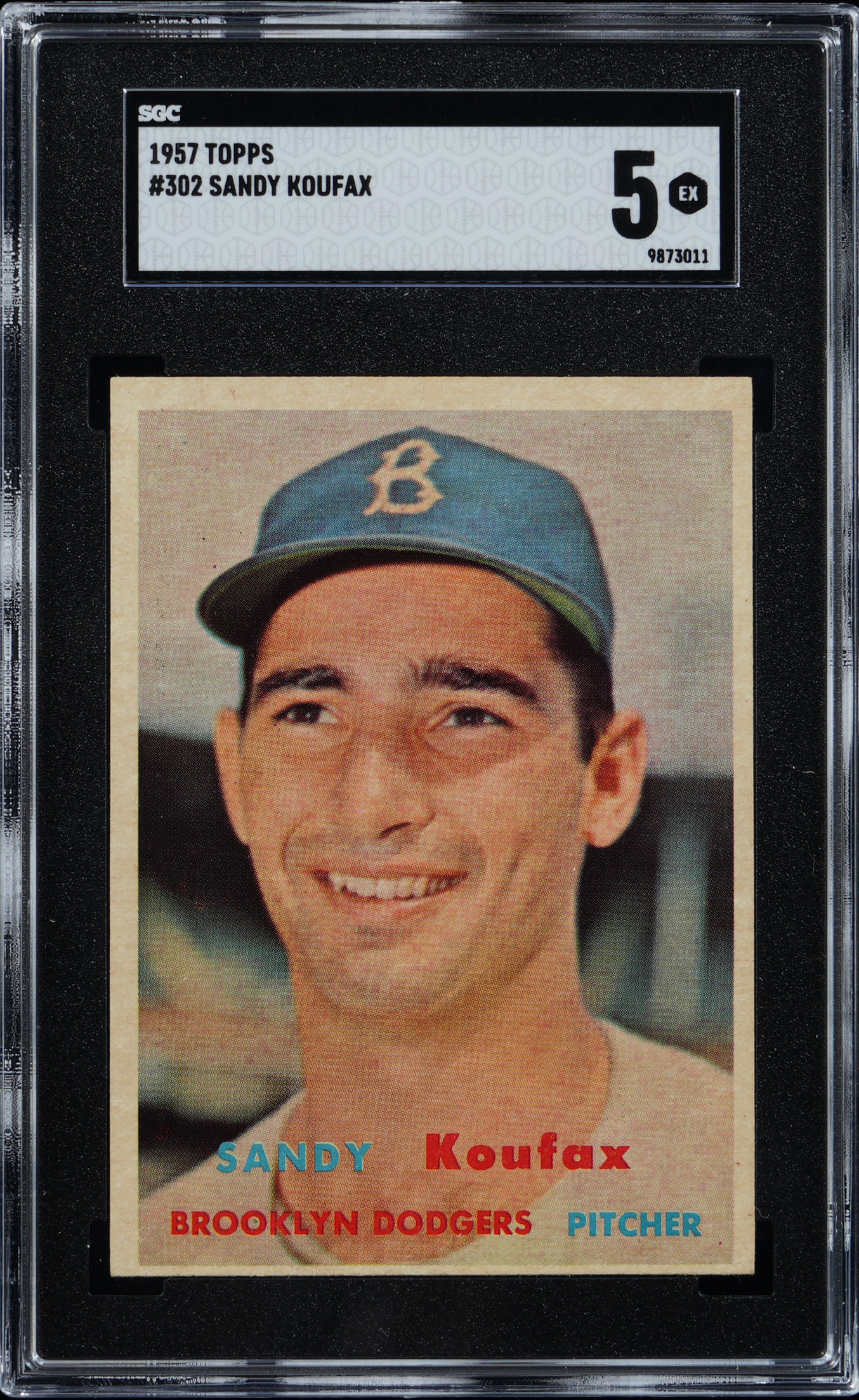 Graded EX-MT 6 by PSA. Very clean 1957 Topps #302 Sandy Koufax fourth series example. Brooklyn Dodgers Hall of Famer.