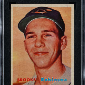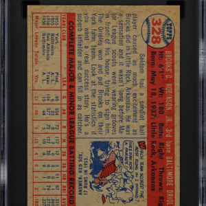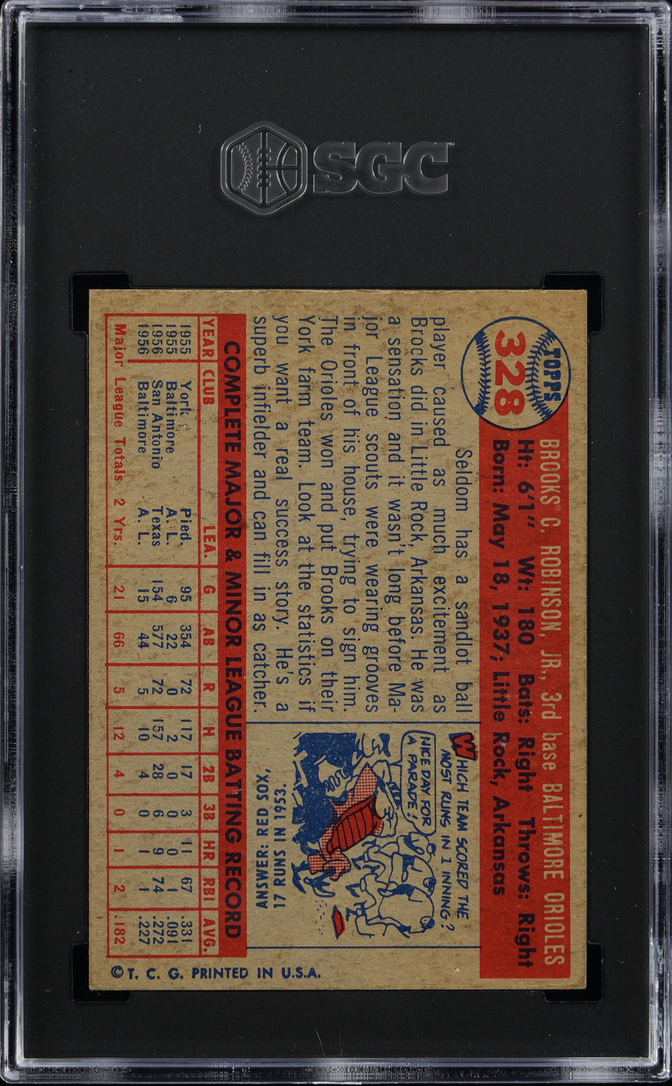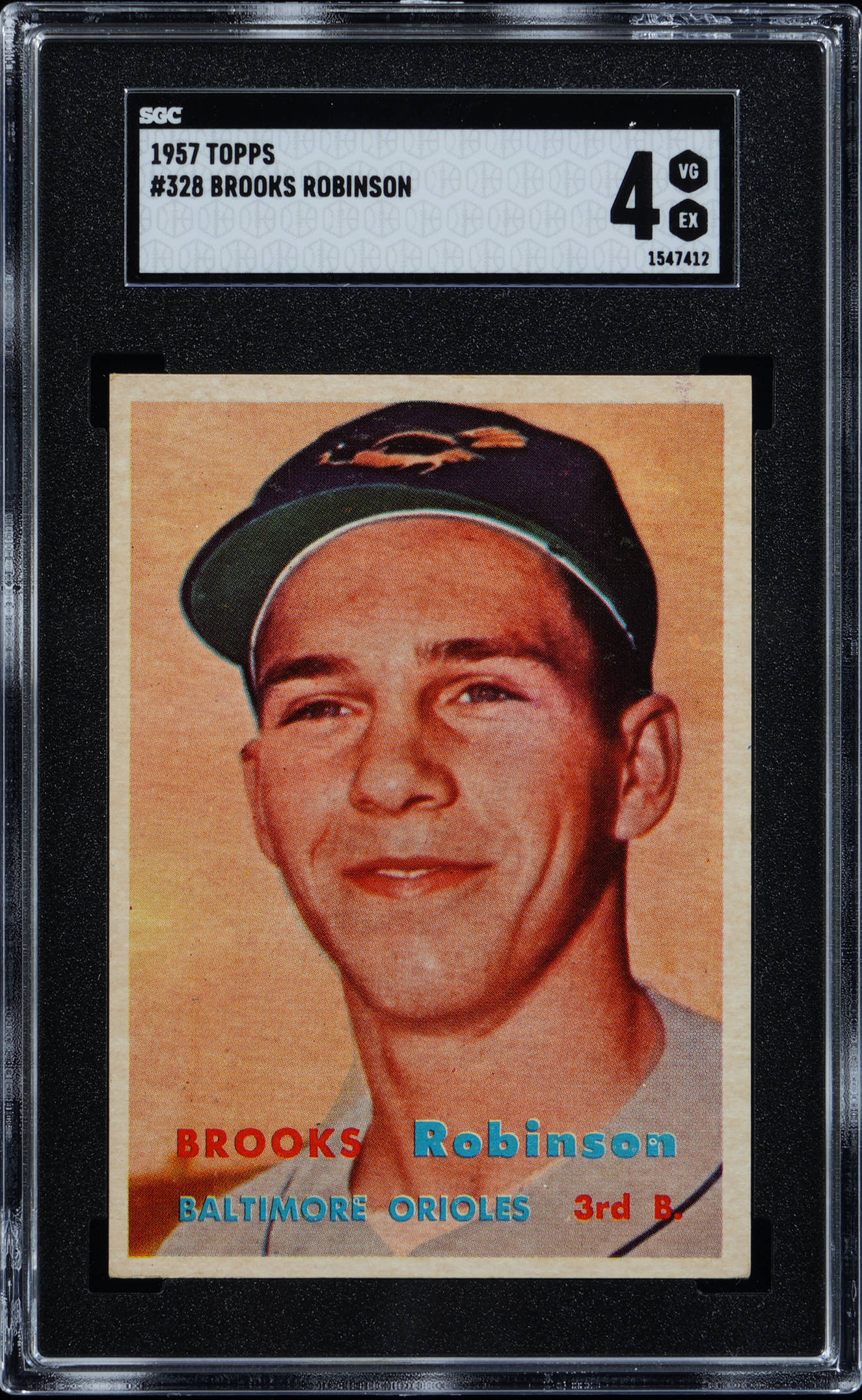 Graded VG/EX 4 by SGC. The pride of Little Rock (and Baltimore) is front-and-center on the offered 1957 Topps #328 Brooks Robinson rookie card. This fourth series example is a quality rendition of the Baltimore Orioles Hall of Fame icon. Presents at the absolute zenith of its overall evaluation.