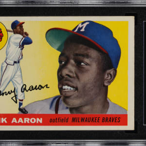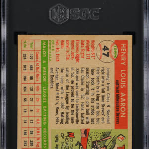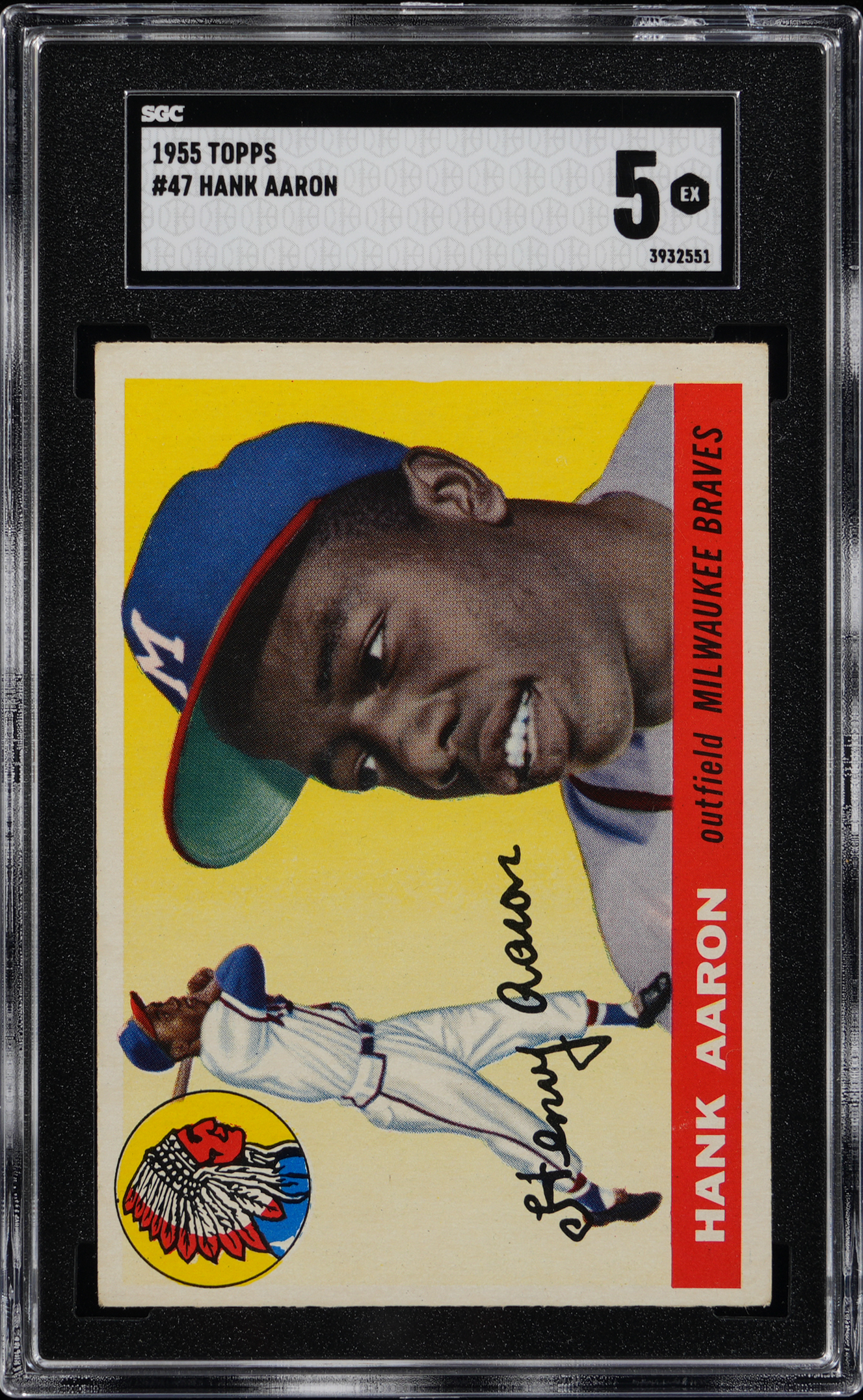 Graded EX 5 by SGC. Impressive 1955 Topps #47 Hank Aaron second-year card. This crisp sophomore example of the Milwaukee Braves Hall of Fame slugger exhibits gleaming surface colors and displays only limited, but not significant corner touches. The creamy reverse is bright and attractive. A viable key card for the set collector!