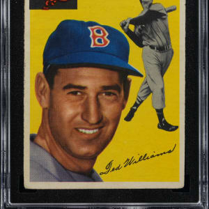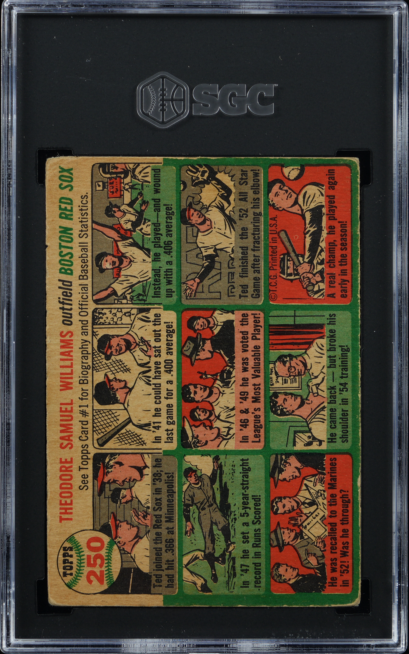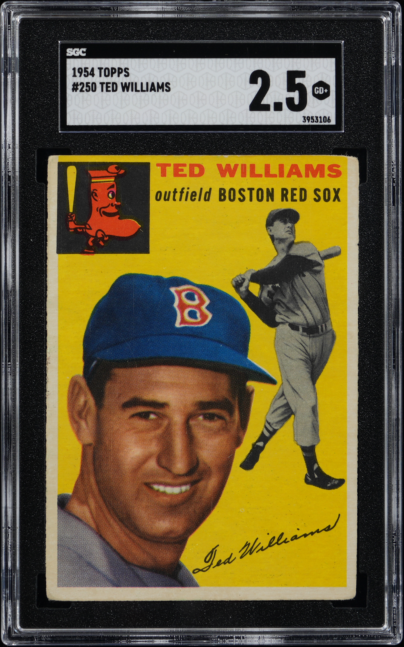 Graded GOOD+ 2.5 by SGC. The grand finale of the 1954 Topps edition is available with the offered #250 Ted Williams send-off. Boston Red Sox Hall of Fame legend.