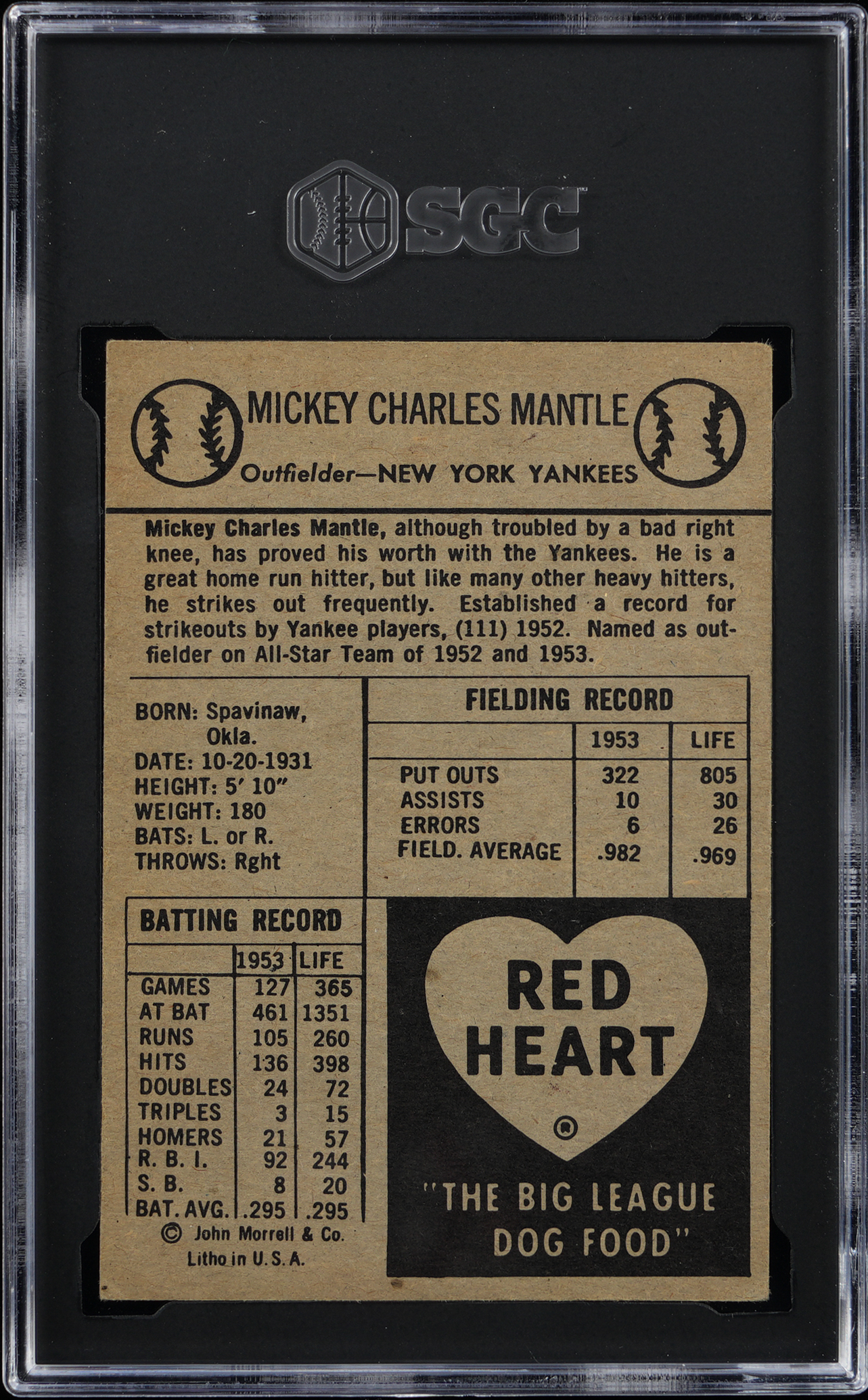 Graded VG 3 by SGC. Throw your vintage oddball collection "a bone" (pun intended) with the offered 1954 Red Heart Dog Food Mickey Mantle. Despite mild corner/edge wear and faint surface impressions, this young "Mick" is still crease-free and presents exceptionally well. New York Yankees Hall of Famer.