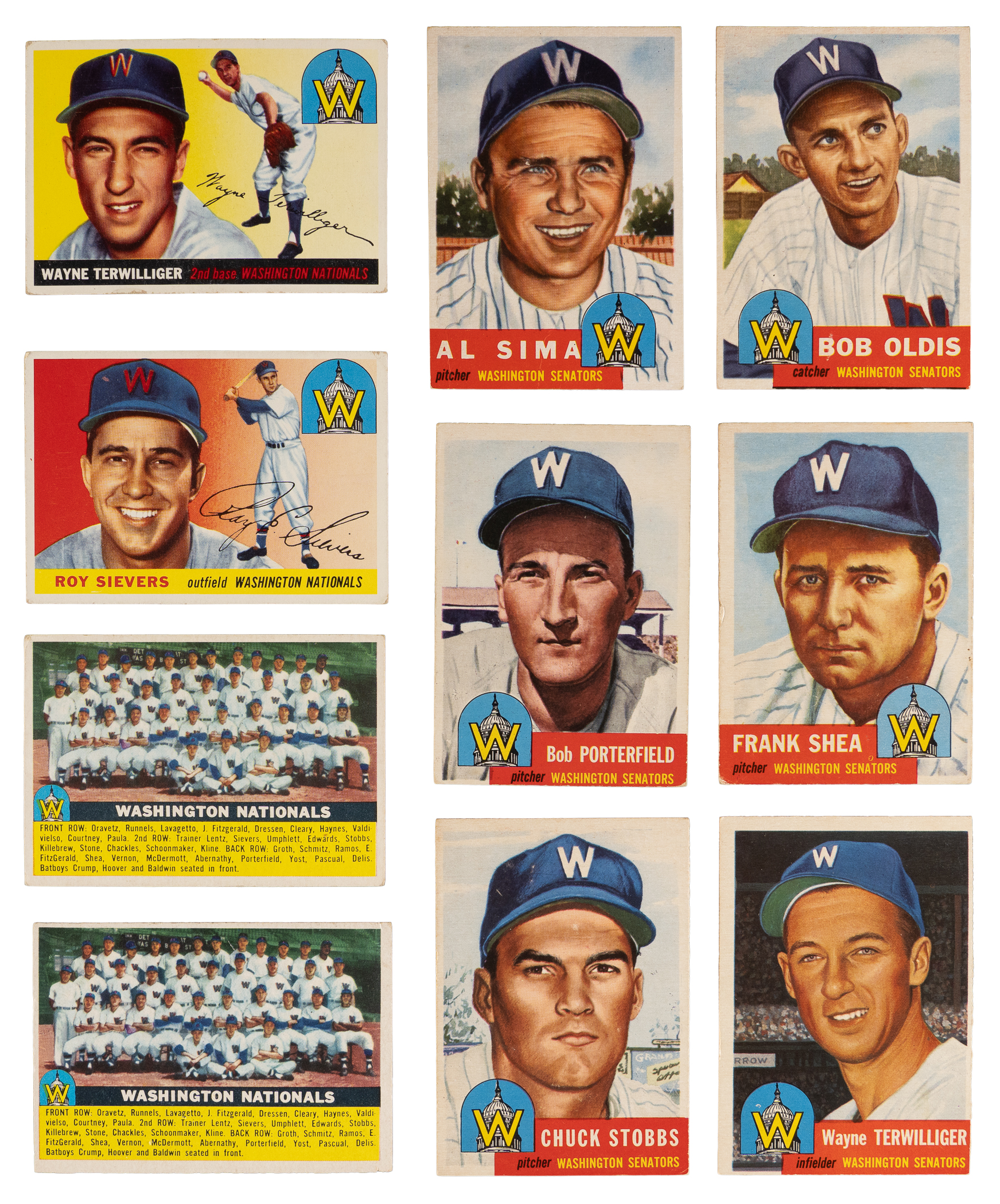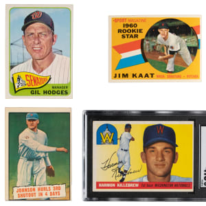 1950s Topps Senators: (82 cards, average VG-EX to EX, includes one SGC graded) with (7) 1953 (with (2) high numbers), (11) 1955 (with 2 high numbers and one SGC graded) with #124 Killebrew RC (SGC VG/EX+ 4.5); (2) 1956, (19) 1957, (20) 1958, (23) 1959;