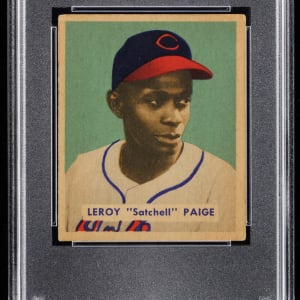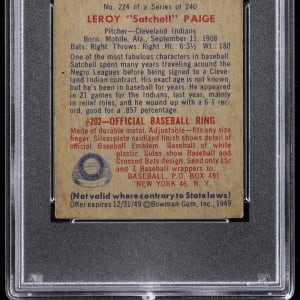 Graded VG-EX 4 by PSA. The peerless Leroy (Satchel) Paige stars on the offered 1949 Bowman #224 rookie card. This Negro League legend is crease-free with relatively strong corners, pinpoint surface registration and clear visual accents. The gray reverse of this high number which confirms the Cleveland Indians Hall of Fame pitcher as "one of the most fabulous characters in baseball" is problem-free. A crucial component for any prospective 1949 Bowman project.