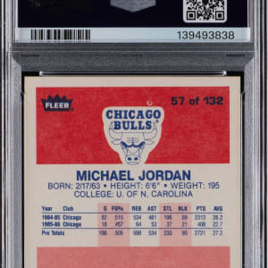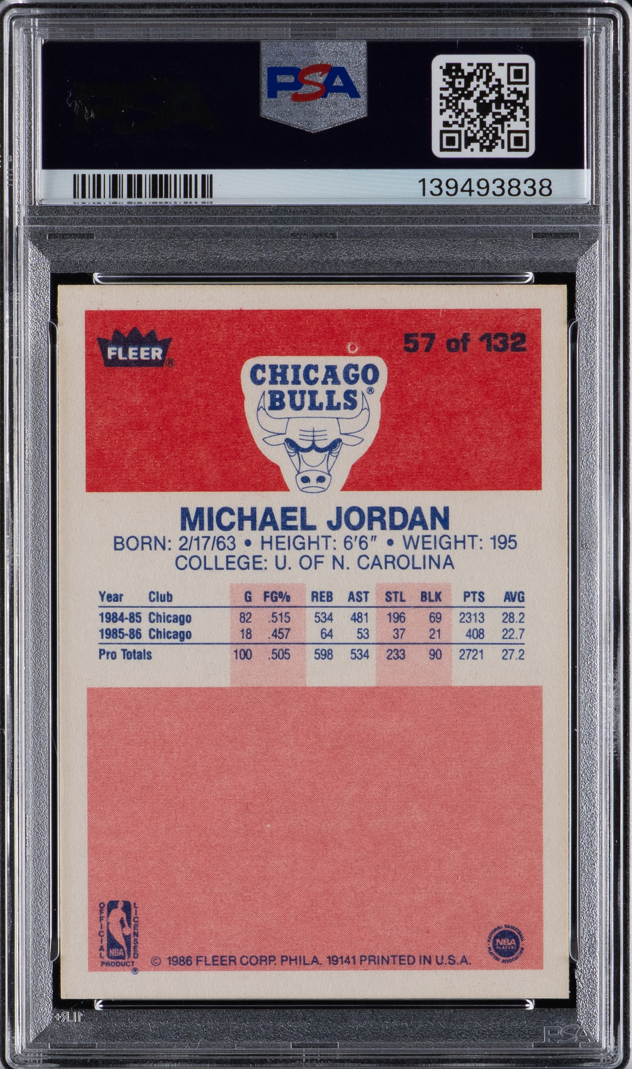 Graded EX 5 by PSA. The offered 1986-1987 Fleer Basketball #57 Michael Jordan rookie card has reached the stature that any example across the grading spectrum is desirable. This high riser is properly centered with even corner wear and glossy surface colors. Presents at the apex of its overall evaluation.
