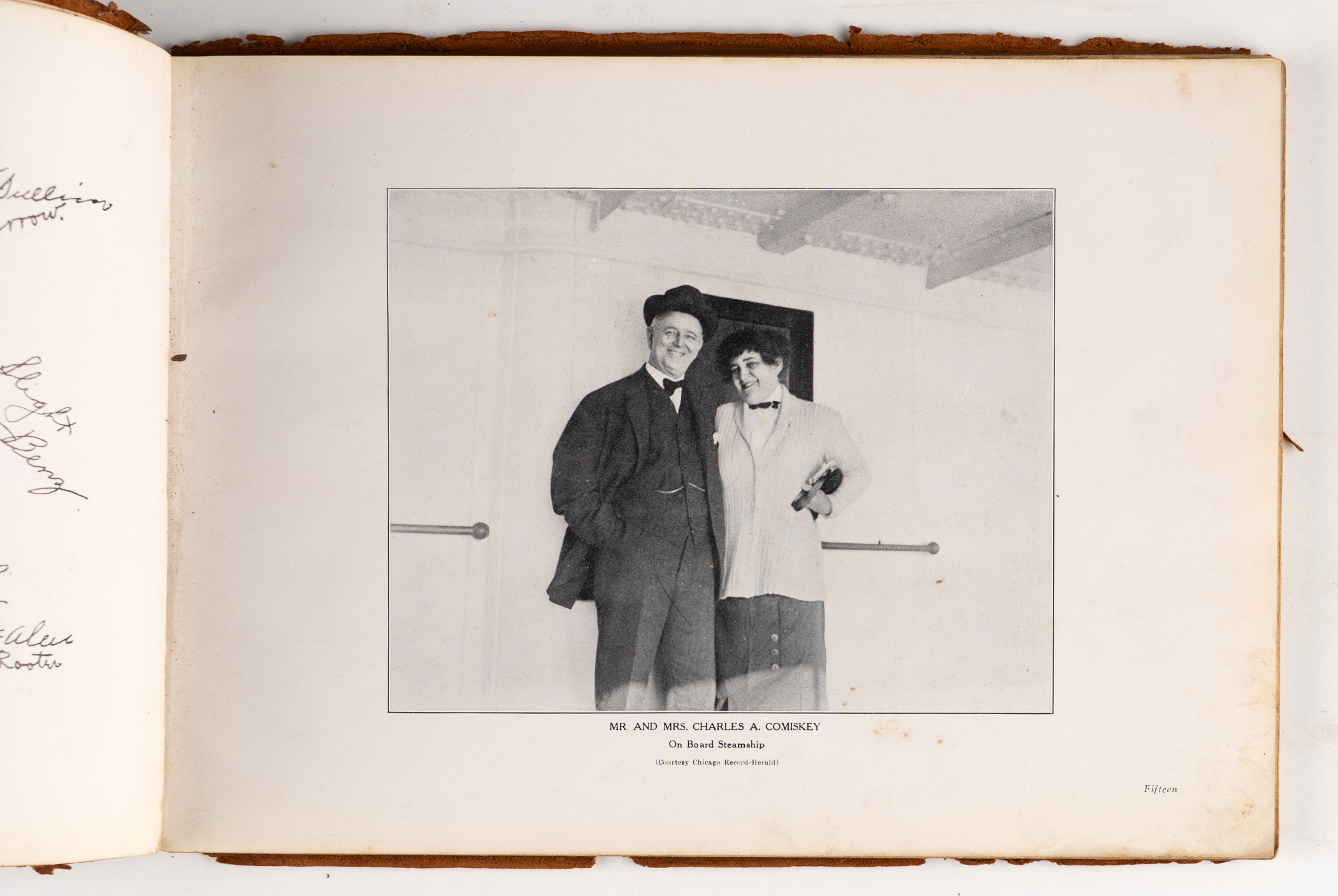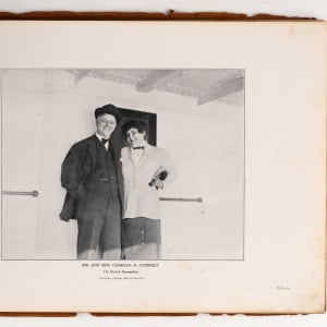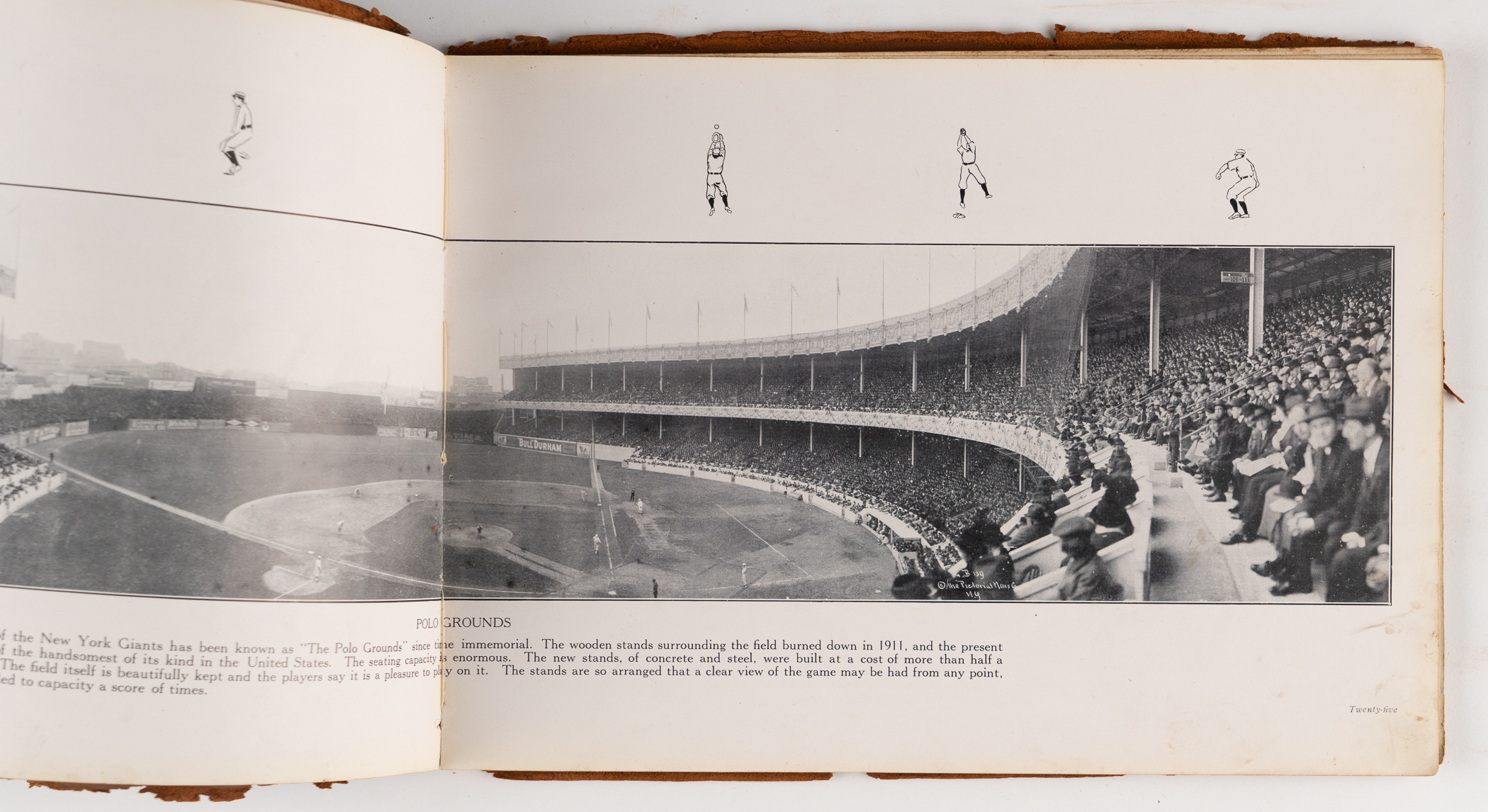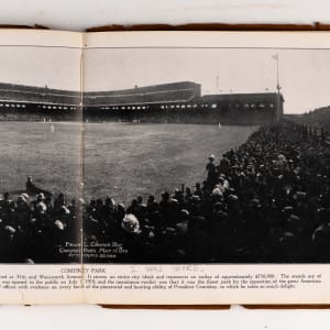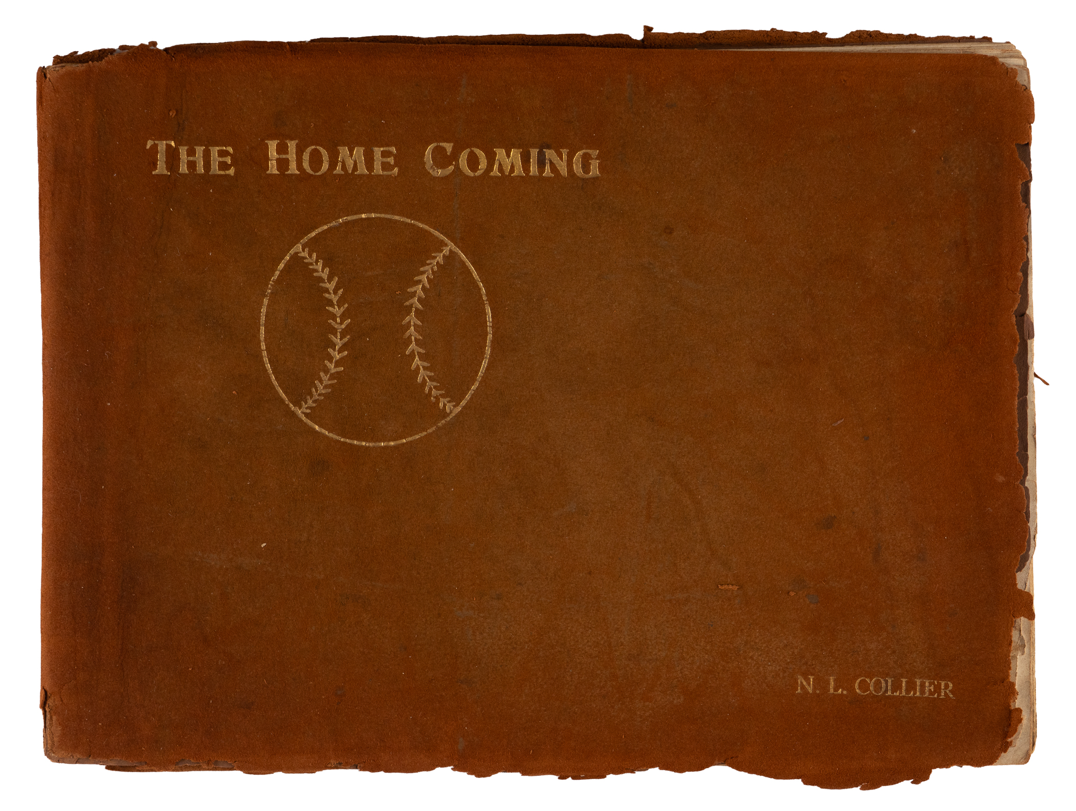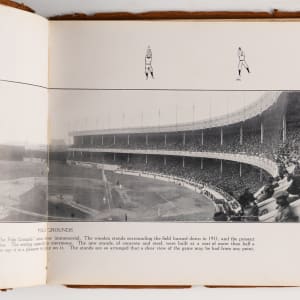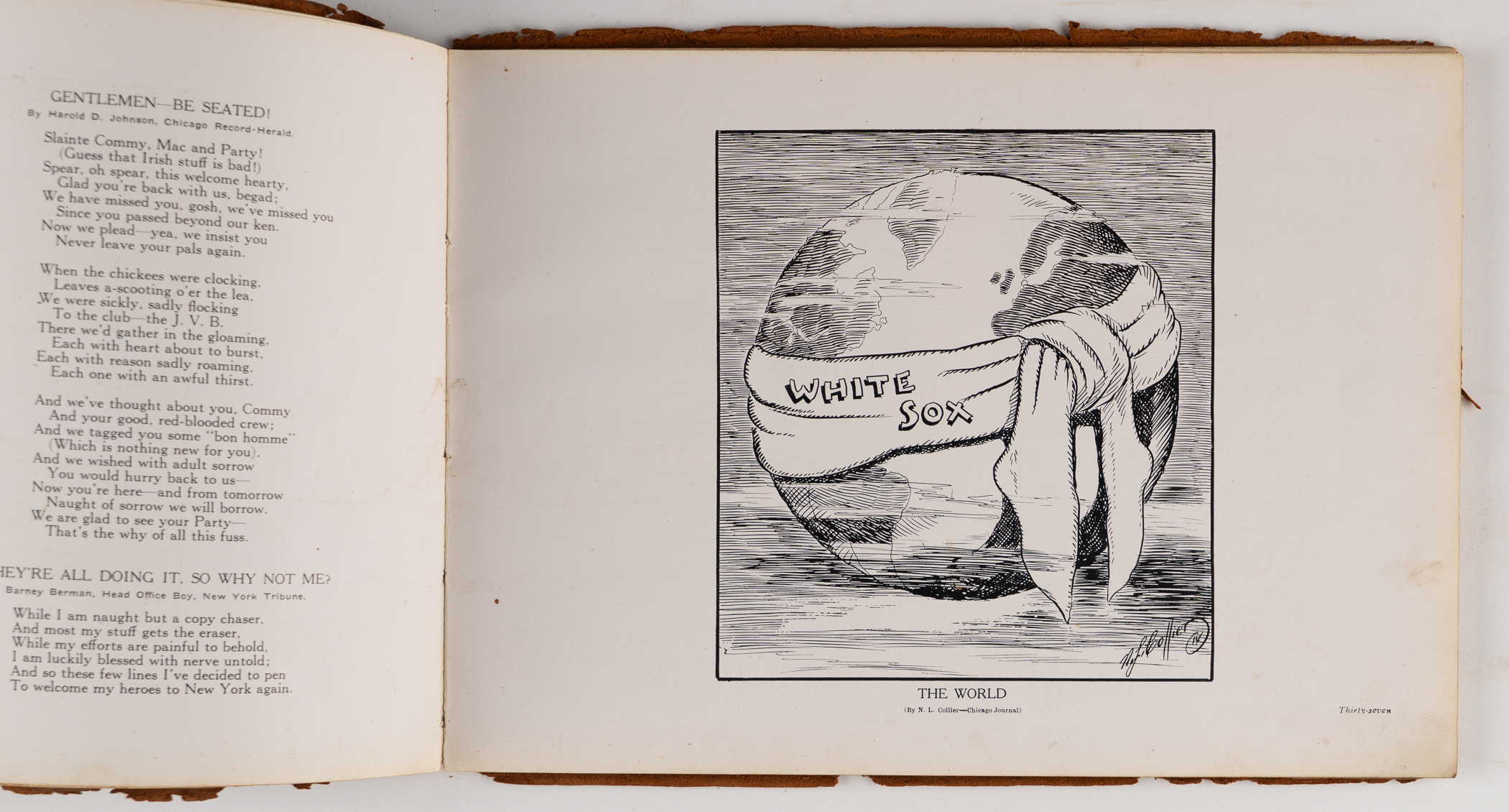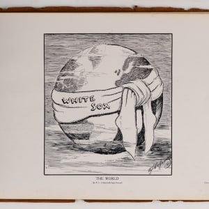 This 8x11 leather-bound book with “The Homecoming – N.L. Collier” on the cover, was given to contributing illustrator Nate Collier, who was a political cartoonist with the Chicago Journal at that time . The inside features one of his cartoons which depicts a pair of white socks encircling the globe. Other pages feature player photos and panoramic photos of the Polo Grounds, as well as Comiskey Park. The album is fragile, and the leather is coming apart. The inside pages, however, remain appealing.