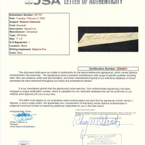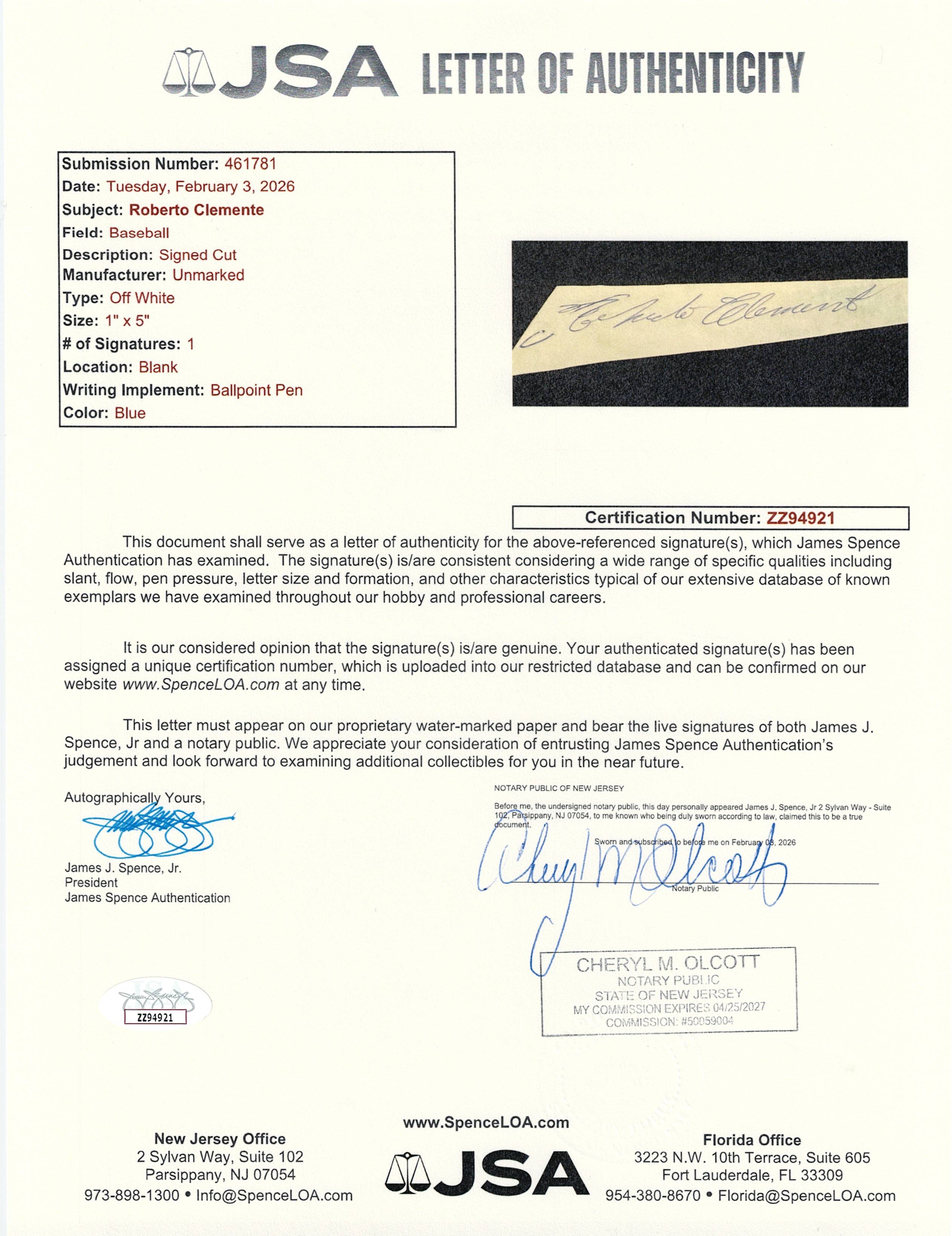 Score a highly prized Hall of Famer autograph, when you reel in this Roberto Clemente cut signature. One of the most beloved figures in baseball’s long history, the heroic Clemente met a tragic fate on New Year’s Eve of 1972, when his chartered plane went down shortly after take-off, on a relief mission to aid earthquake victims in Nicaragua. This satisfying Clemente signature shows off sharply against a 5” x 1” cut, that promises great display appeal.