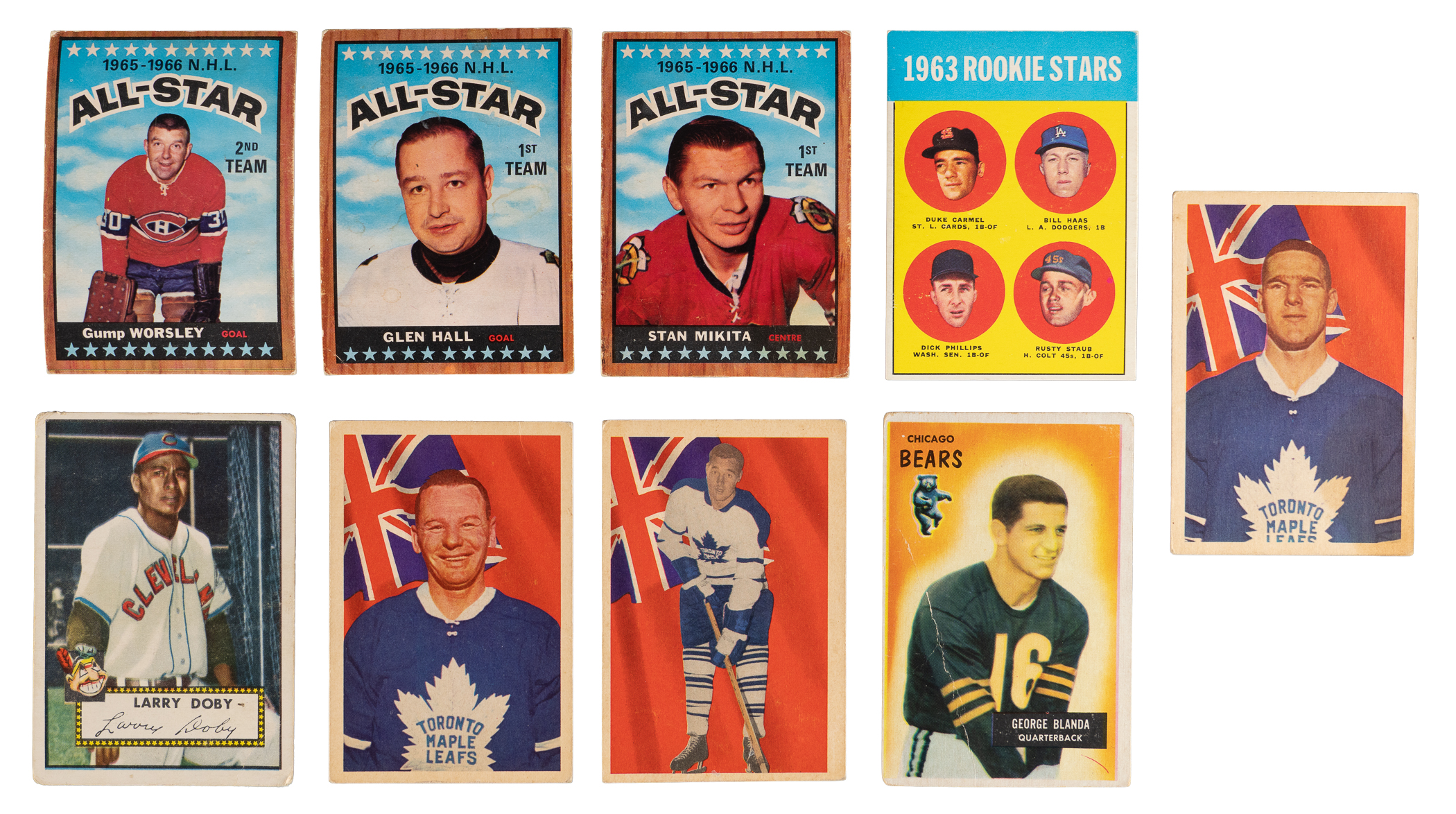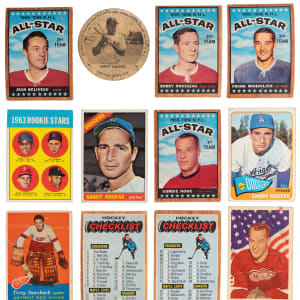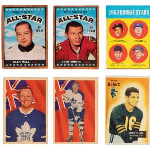 Hockey: (50 cards, average FR to GD) with 1957-1958 Topps #35 Sawchuk (PR, reverse paper loss), 1963-1964 Parkhurst: #5 Bower (VG), #16 Horton (GD, stain), #50 Howe (PR, writing), #77 F. Mahovlich (GD); 1964-1965 Topps #75 Brewer (GD), #76 MacGregor (GD), #88 Tremblay (VG); 1965-1966 Topps: #65 Hodge/Worsley (GD), #66 CL (GD), #120 CL (GD), #121 Howe AS (GD), #124 Mikita AS (FR), #126 Hall AS (FR), #127 Beliveau AS (FR), #130 Worsley AS (GD), #131 F. Mahovlich AS (GD), #132 Rosseau AS (VG)