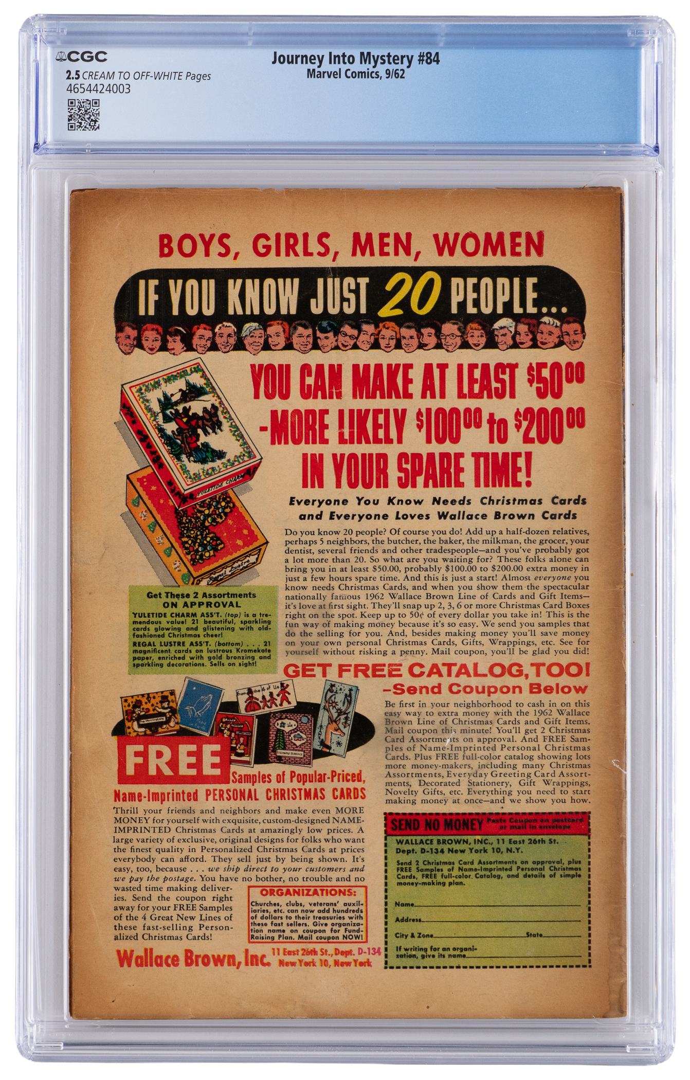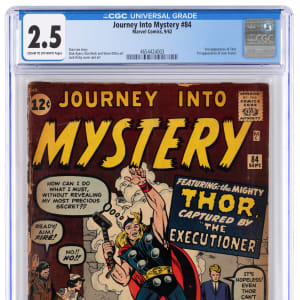 Say hello to treasured character Jane Foster, when you come face to face with this 9/62 Marvel Journey Into Mystery #84 issue. On top of featuring Jane's first appearance, this Silver Age key issue also stands as the second appearance of the title's star, Thor. We'll keep piling on the good stuff, by pointing out the creators who had a hand in this prized issue are Stan Lee, Jack Kirby, Dick Ayers, Don Heck and Steve Ditko, legends one and all. Then there's the 2.5, Cream to Off-White Pages grade assigned by CGC, a respectable rating for any comic from this period. Label notes are "Stan Lee story, Dick Ayers, Don Heck and Steve Ditko art, Jack Kirby cover and art. 2nd appearance of Thor. 1st appearance of Jane Foster.".