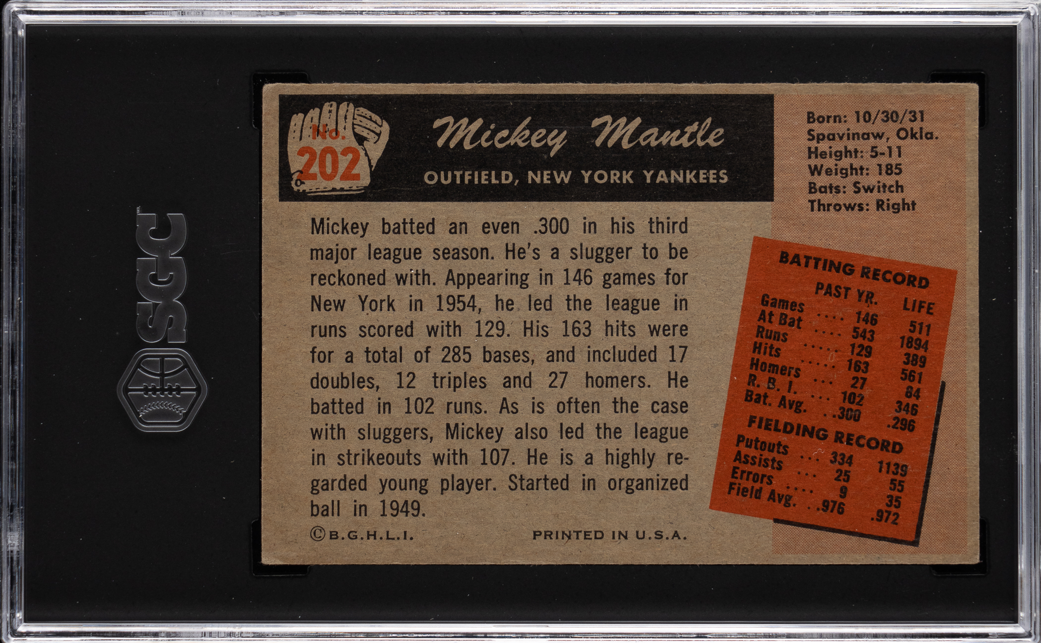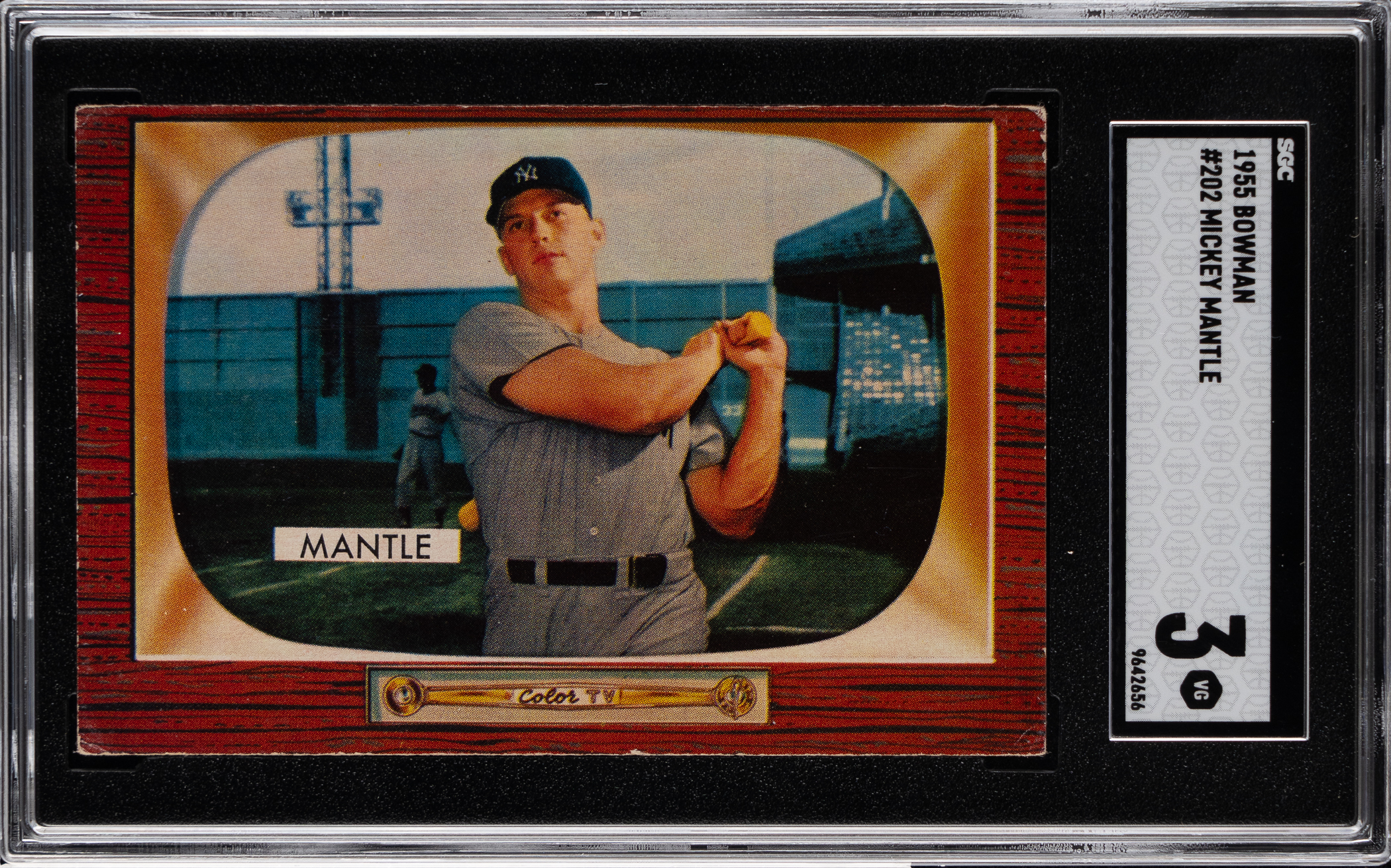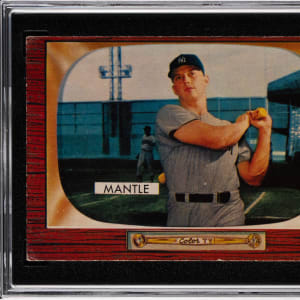 Graded VG 3 by SGC. The 1955 campaign witnessed a surge in home runs for New York Yankees Hall of Famer Mickey Mantle as the young superstar paced the American League for the first time in that offensive category. Tune in to the offered 1955 Bowman #202 Mickey Mantle single. With exception to factory errant centering, this #7 is otherwise crease-free with only moderately worn corners. The biographical reverse is wax stain-free.