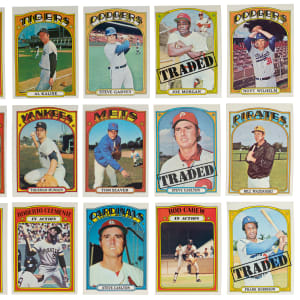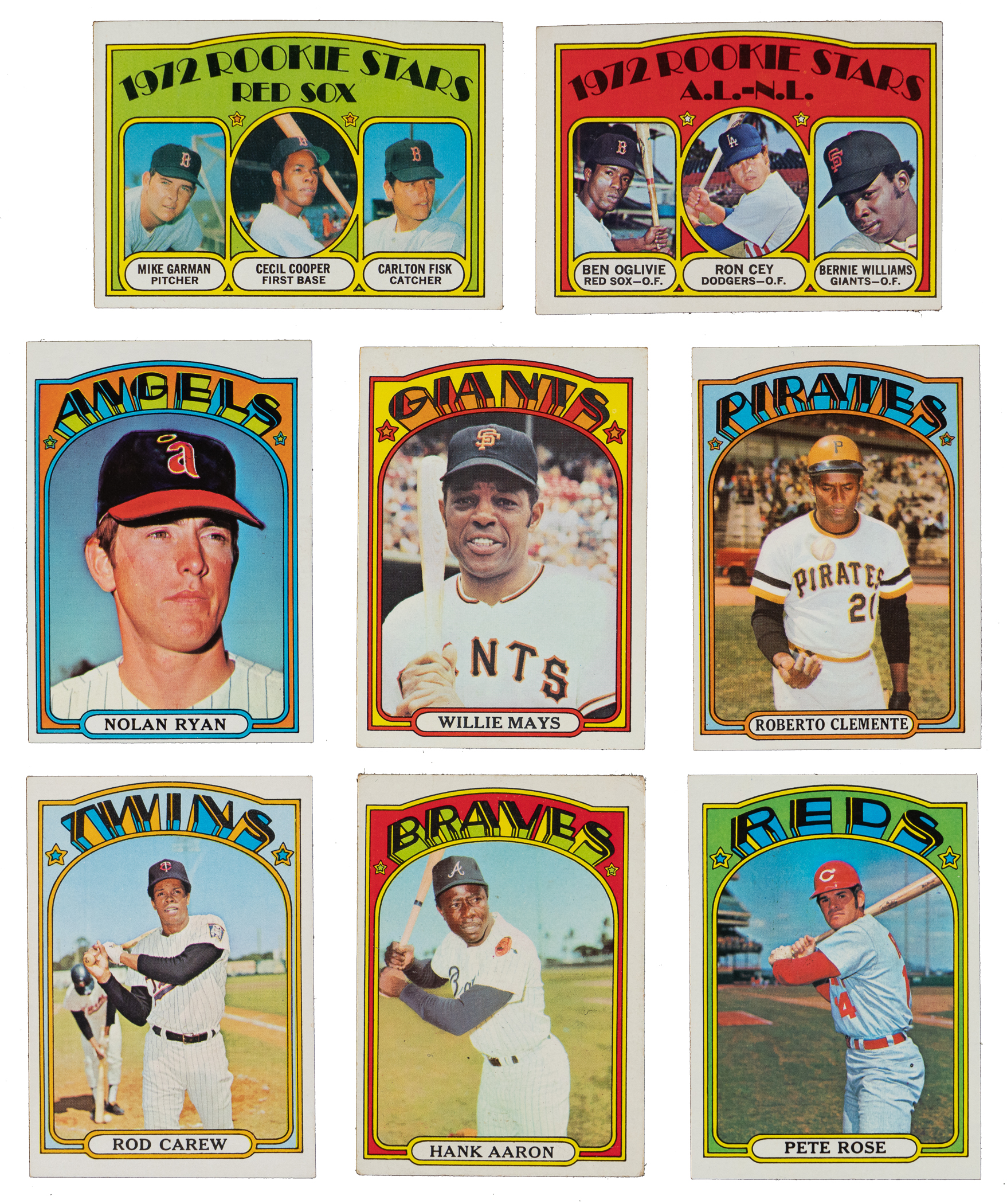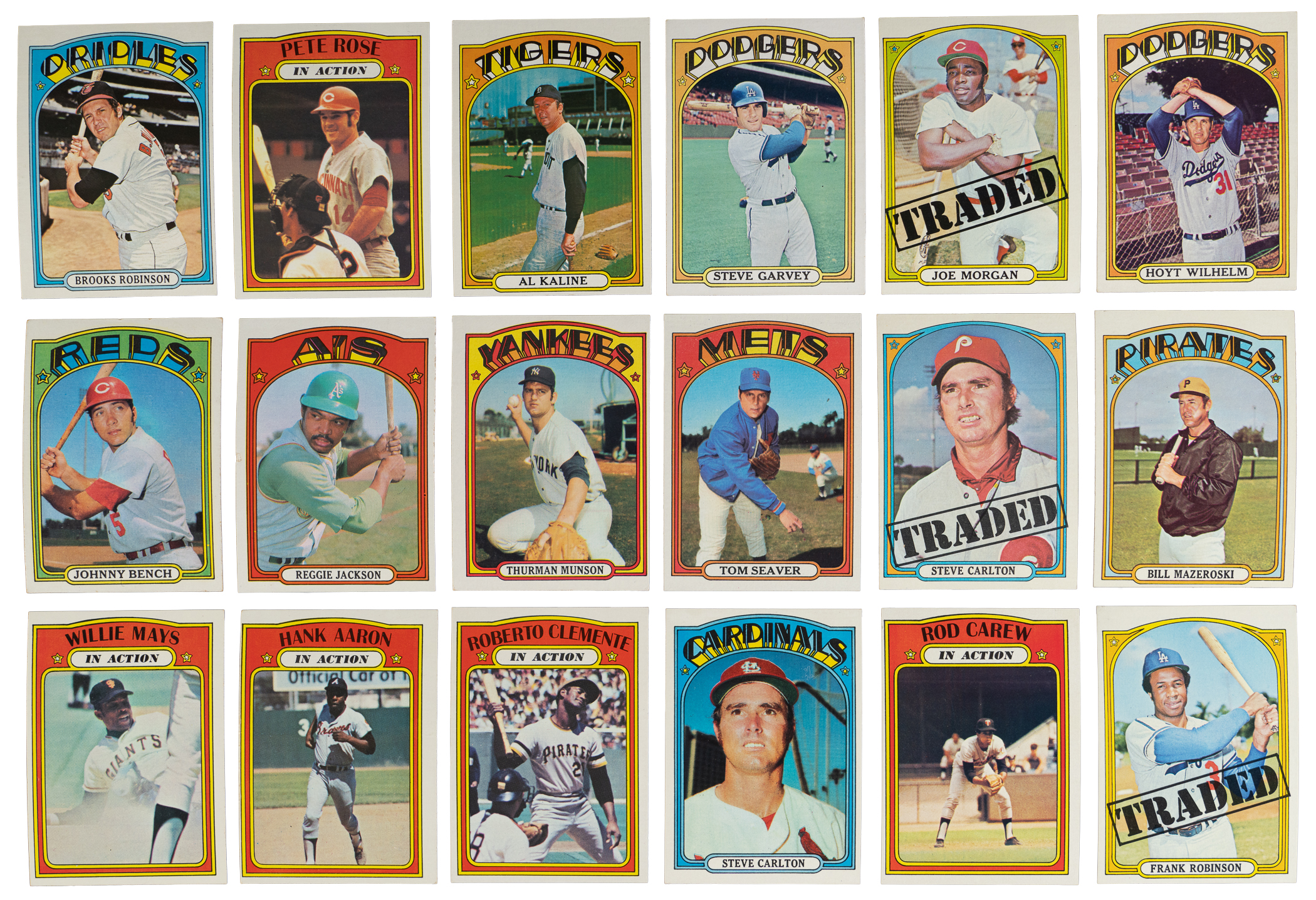 Electric 1972 Topps complete set of (787) cards. These psychedelic superstars have an approximate condition breakdown of 30% (EX-MT or better), 30% (EX), 25% (VG-EX) and 15% (VG or lesser) with the challenging high series generally presenting on level with the more available numbers. Highlights include: #49 Mays (EX), #50 Mays IA (VG), #79 Fisk/Cooper RC (EX), #299 Aaron (GD), #300 Aaron IA (VG), #309 Clemente (EX), #310 Clemente IA (EX), #420 Carlton (EX), #433 Bench (VG-EX), #435 R. Jackson (EX-MT), #441 Munson (VG-EX), #445 Seaver (EX-MT), #550 B. Robinson (VG-EX), #559 Rose (EX-MT), #560 Rose IA (EX-MT), #595 Ryan (EX), #600 Kaline (EX), #686 Garvey (VG-EX), #695 Carew (VG-EX), #696 Carew IA (VG-EX), #751 Carlton TRD (EX), #752 Morgan TRD (VG-EX), #754 F. Robinson TRD (VG), #760 Mazeroski (EX), #761 Oglivie/Cey RC (VG) and #777 Wilhelm (EX).