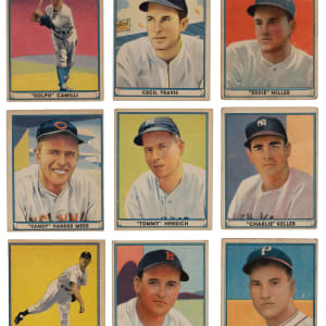 Legends from the Summer of ’41 compete with the offered 1941 Play Ball near complete set of (67/72) cards with ten Hall of Famers. This storied edition has an overall approximate condition breakdown of 35% (VG or better), 35% (GD) and 30% (FR or lesser). Keys include: #1 Miller (PR), #6 Hubbell (FR), #8 Ott (VG), #10 Vaughan (FR), #15 Cronin (FR), #19 Gehringer (GD), #20 Ruffing (FR), #21 Keller (FR), #39 Henrich (VG, oversized), #48 Travis (VG), #51 Camilli (FR), #56 Vander Meer (VG), #60 Klein (VG), #61 V. DiMaggio (VG), #63 D. DiMaggio (GD), #64 Doerr (VG-EX), #70 Dickey (GD) and #72 Gomez (FR). Missing only #13 Foxx, #14 T. Williams, #18 Greenberg, #54 Reese RC and #71 J. DiMaggio for completion.