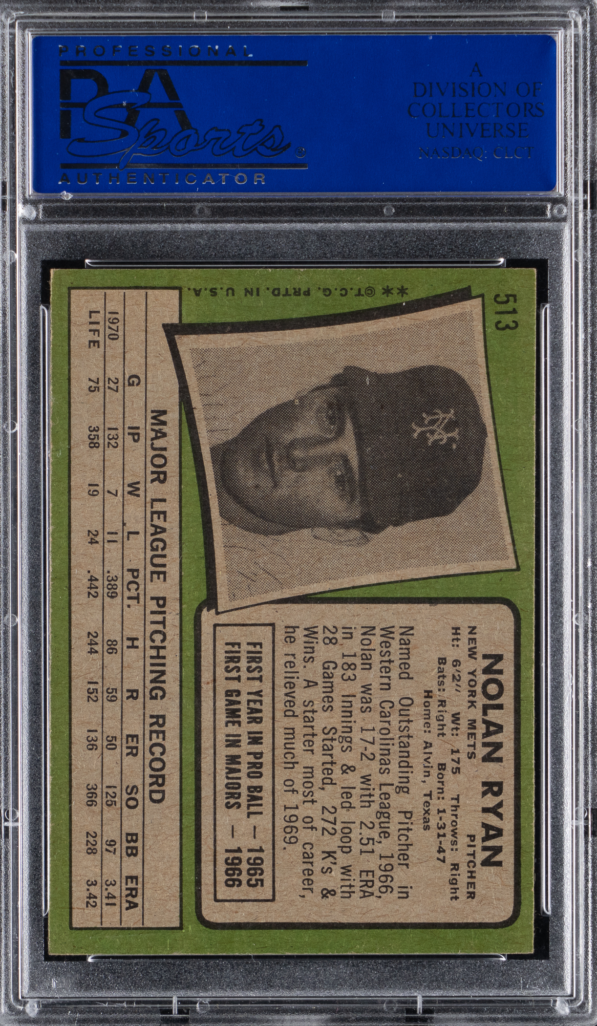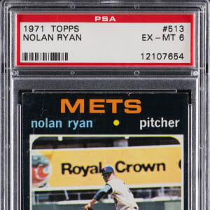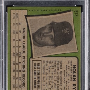 Graded EX-MT 6 by PSA. Pitch black 1971 Topps #513 Nolan Ryan.