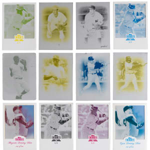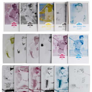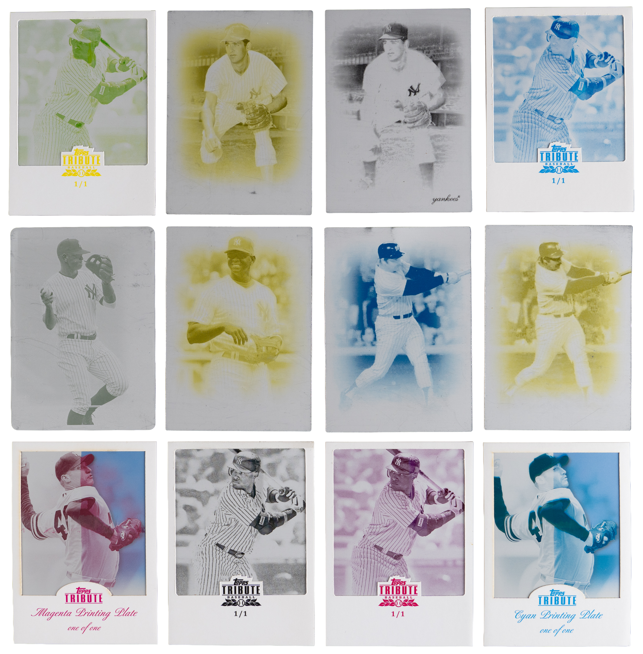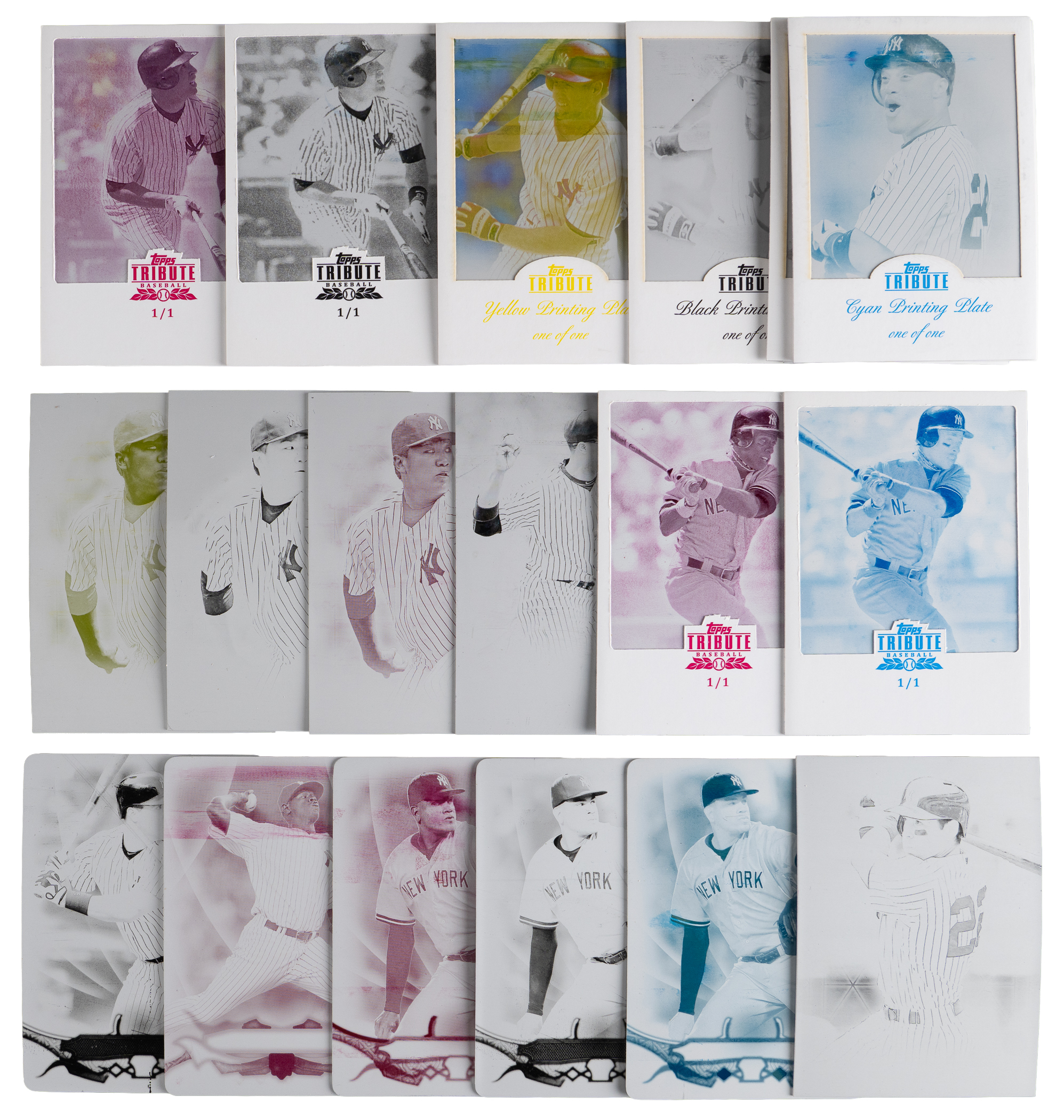 Hot off the presses are these (32) 2009-2016 Topps Tribute New York Yankees #1/1 printing plates. Includes: 2009 Topps Tribute: (6 plates) with (2) #18 Larsen (black, yellow), (2) #20 Munson (cyan, yellow), #77 A. Rodriguez (yellow), #85 Teixeira (yellow); 2010 Topps Tribute: #53 A. Rodriguez (magenta); 2012 Topps Tribute: (7 plates) with (3) #19 Cano near, (2) #58 O’Neill, (2) #60 Pettitte; 2013 Topps Tribute: (8 plates) with (2) #31 Teixeira, (4) #38 Cano, (2) #61 Granderson; 2014 Topps Tribute: #24 Cano; 2015 Topps Tribute: (4 plates) with (3) #29 Tanaka near, #74 Ellsbury; 2016 Topps Tribute: (5 plates) with (3) Betances, #88 Teixeira and #16R-6 Severino RC.