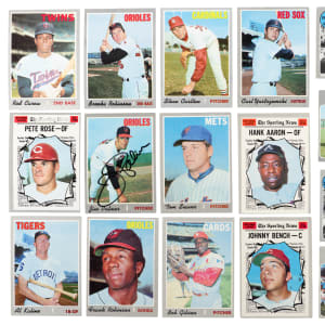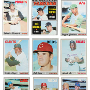 From the season in which the Birds claimed the crown arrives the offered 1970 Topps complete set of (720) cards. These silver borders have an approximate condition breakdown of 20% (EX-MT or better), 30% (EX), 25% (VG-EX) and 25% (VG or lesser) with the challenging high series generally presenting on level with the more available numbers. Highlights include: #1 Mets Team (VG), #10 Yastrzemski (VG-EX), #140 R. Jackson (VG-EX), #189 Munson RC (FR, typing on front), #197 Ryan Playoffs (VG), #198 Mets Celebrate/Ryan (EX-MT), #211 T. Williams (VG), #220 Carlton (EX-MT), #230 B. Robinson (VG), #290 Carew (EX), #300 Seaver (VG), #350 Clemente (VG), signed #449 Palmer (“9”, card EX, Auction LOA from James Spence/JSA), #458 Rose AS (VG), #462 Aaron AS (VG), #464 Bench AS (VG), #500 Aaron (VG-EX), #530 Gibson (EX-MT), #580 Rose (EX), #600 Mays (EX), #630 Banks (VG-EX), #640 Kaline (EX), #660 Bench (EX), #700 F. Robinson (trimmed), #712 Ryan (VG) and #713 Pilots Team (VG).