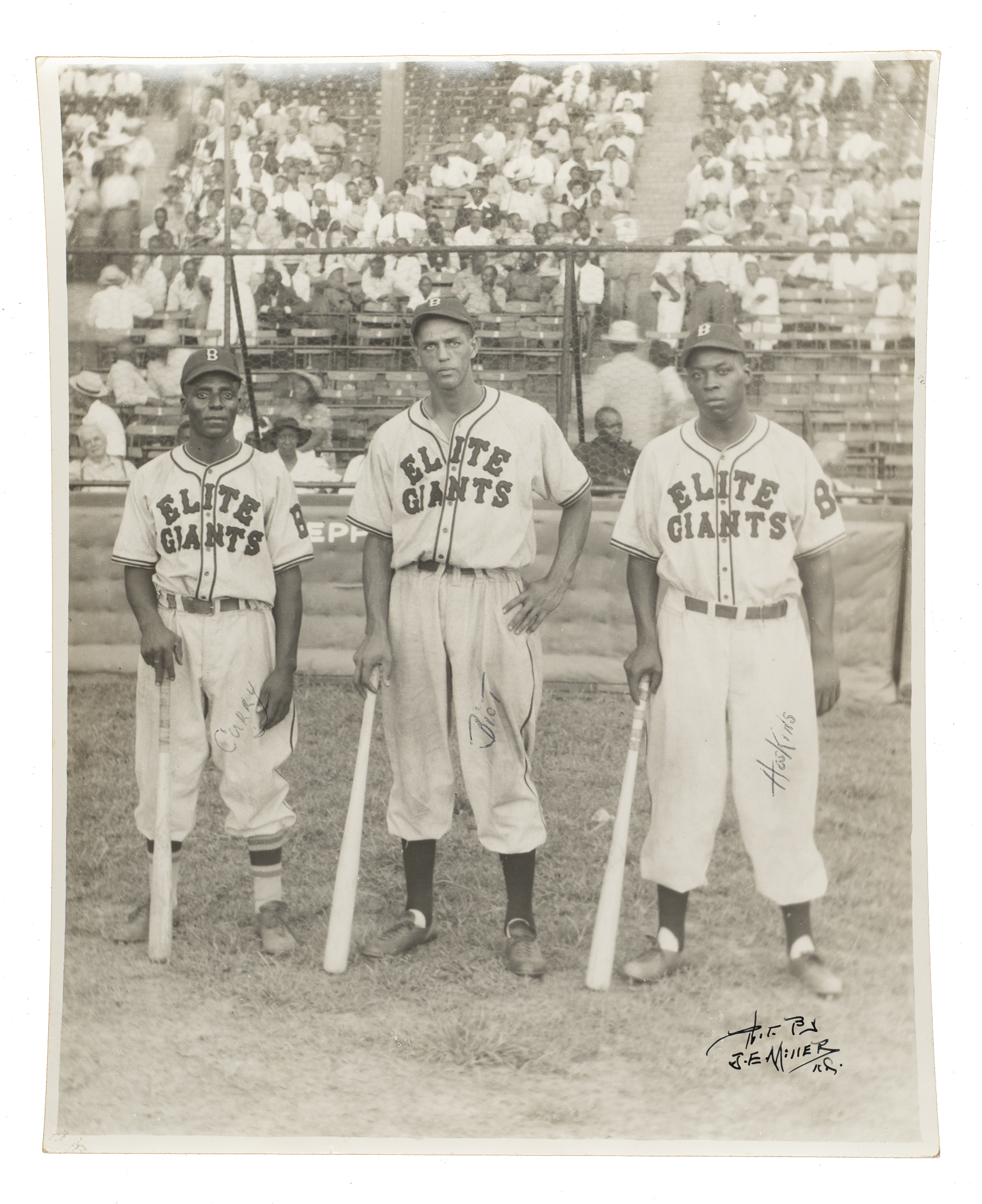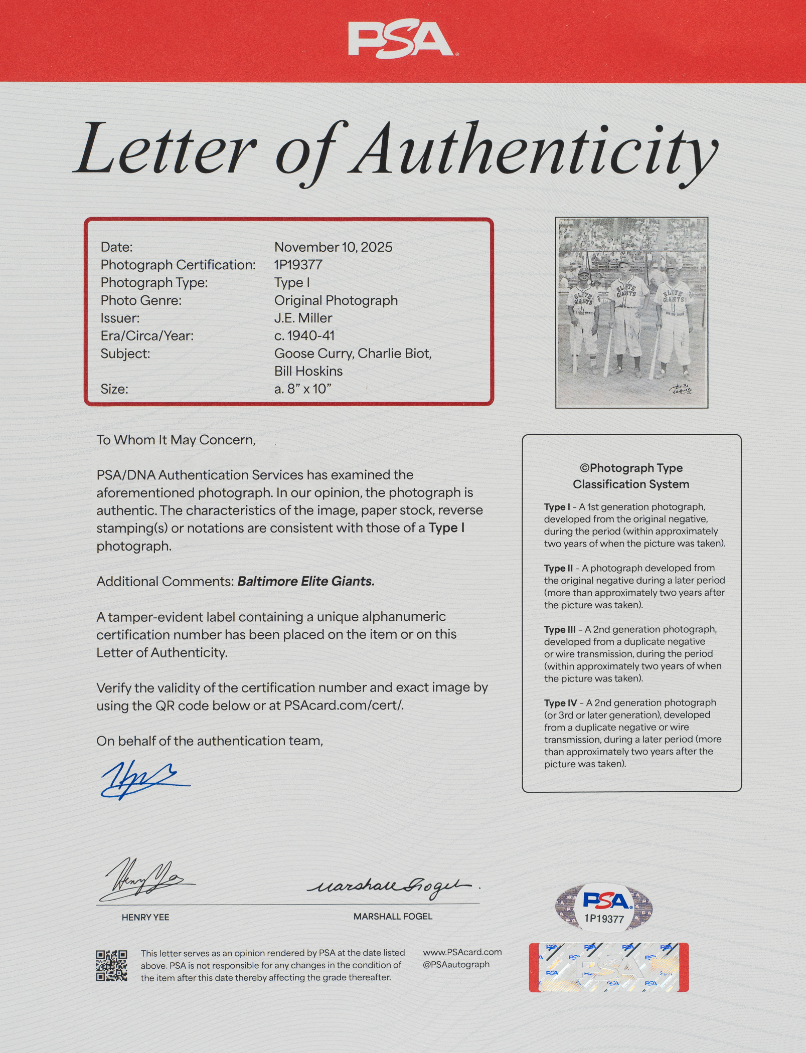 Superb original photograph featuring three members of the 1940-1941 Baltimore Elite Giants posed on the field in front of the stands. The three players (Goose Curry, Charlie Biot, and Bill Hoskins) each are in full uniform and posed leaning on bats. There are last-name identifiers written in ink on each player's leg. Measuring just shy of 8 x 10 inches, the photograph displays exceptional clarity and detail and remains in Very Good condition overall, with a faint diagonal crease passing through the center along with light creasing in the top right corner. A photographer's credit appears in the lower right (J.E. Miller) and a small pencil notation is present on the blank reverse. An outstanding original photograph from this important Negro League team!