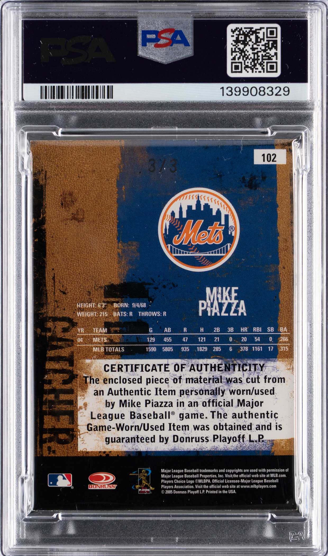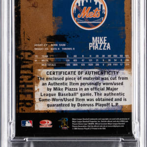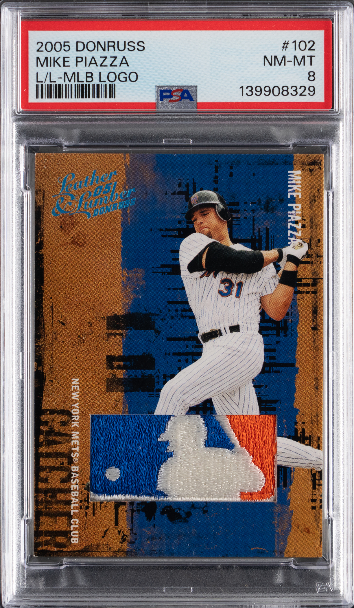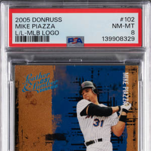 Serially numbered #3/3. Graded NM-MT 8 by PSA. New York Mets Hall of Famer Mike Piazza goes deep with this significant 2005 Donruss Leather & Leather #102 Mike Piazza logoman patch. The offered national treasure is "a must" for modern Cooperstown themed hobbyists! Note: Introduced by Major League Baseball prior to the 1969 season, the red-white-and-blue "batter" logo is synonymous with our national pastime. As such, verified pieces of "logoman" memorabilia are highly prized throughout the modern collecting industry. Huggins & Scott Auctions was recently selected to offer a comprehensive collection of low numbered game-used "logoman" patches in both our Winter 2026 and Spring 2026 auctions. To affirm authenticity, we submitted multiple cards for third-party authentication with all having received numerical grades.
