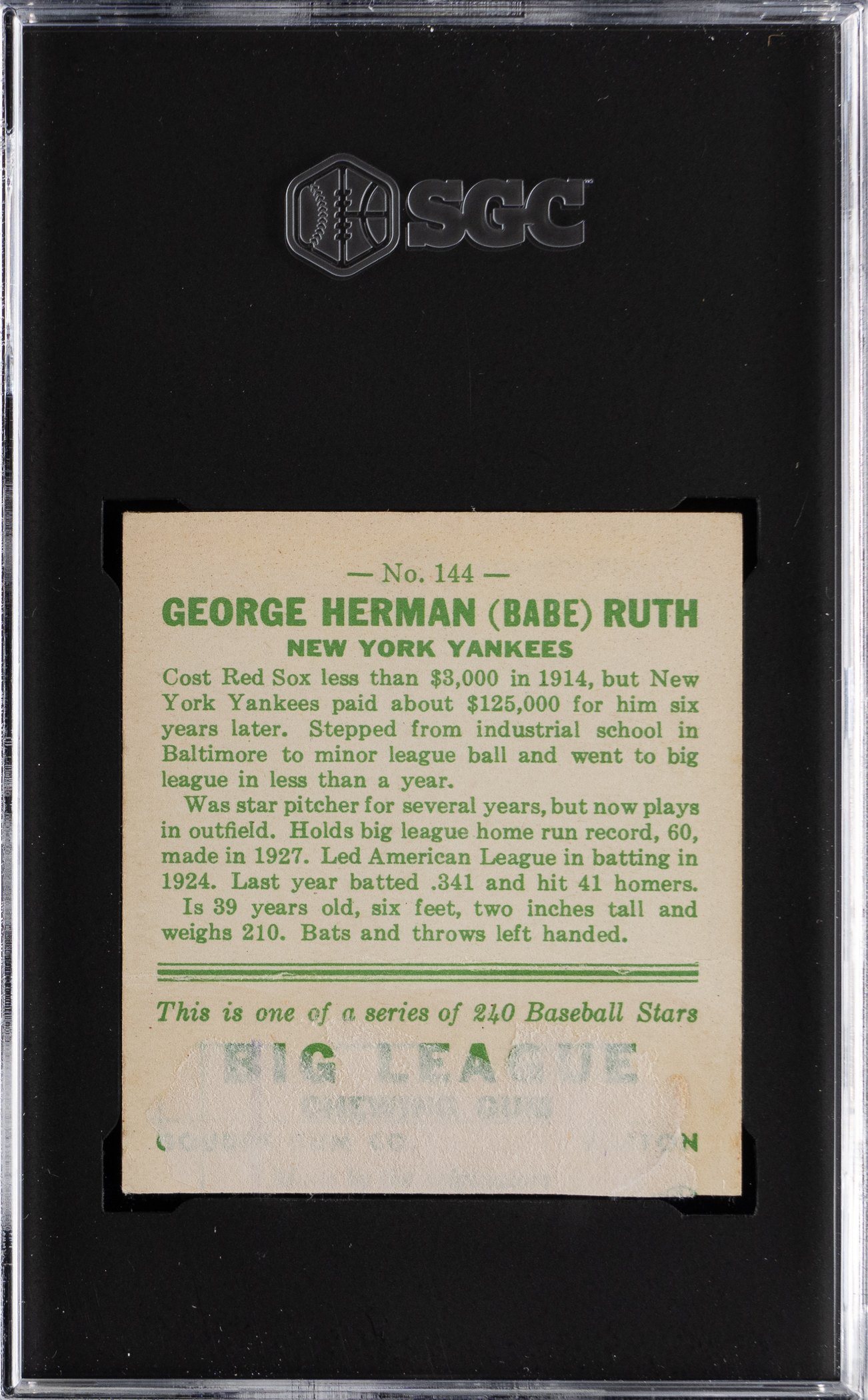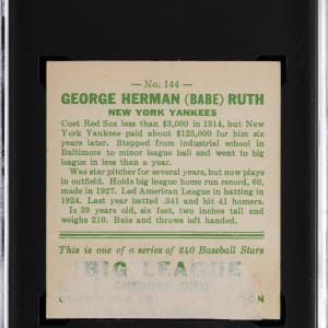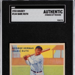 Graded AUTHENTIC by SGC due to the "Big League Chewing Gum" section being trimmed and reverse paper residue. The offered 1933 Goudey #144 Babe Ruth was obviously admired by its original owner. Despite horizontal creasing, this full-body portrayal of the once-in-a-lifetime talent is still quite lovely.