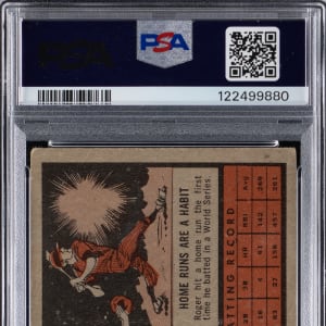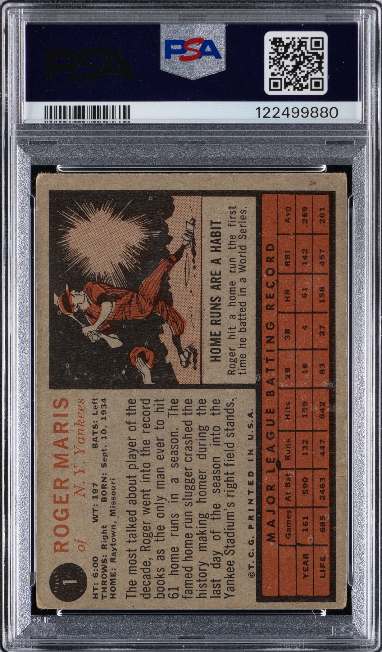Signature judged Authentic by PSA/DNA, encapsulated, and awarded a "9" Auto grade. New York Yankees slugger Roger Maris earns top billing as first card in the 1962 Topps set with the offered signed example. The slightly creased foundation grades in overall (GD) condition and is neatly inscribed in blue ballpoint ink with the centered autograph presenting magnificently well. This record breaker will serve as a proud centerpiece of any signed '62 collection!