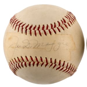 Joe DiMaggio (HOF) single-signed OAL/Cronin ball with lightly faded sweet spot signature, and considerably faded factory labeling stamps. Though the sweet spot area is lightly stained, the DiMaggio autograph remains instantly recognizable.