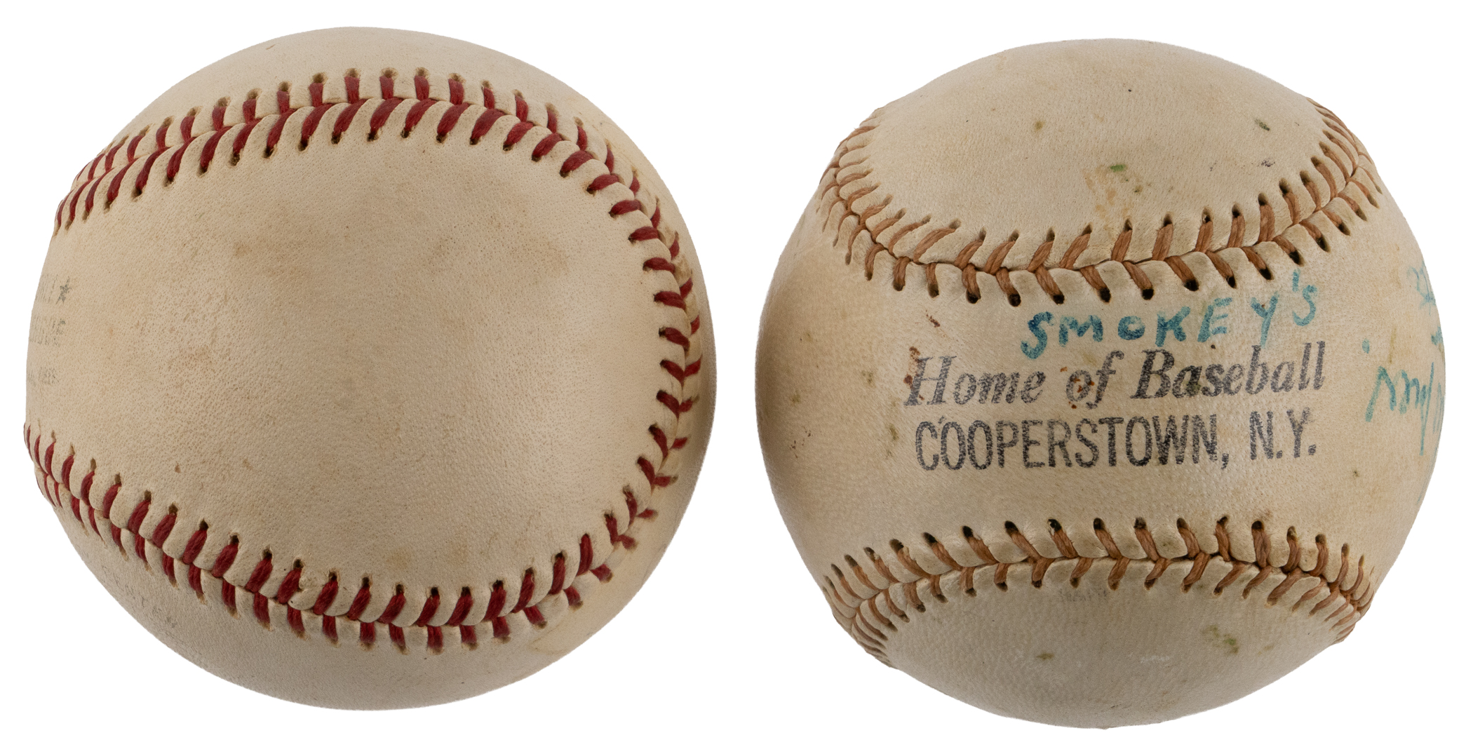 Hall of Famers and stars multi-signed ball with "Smokey's" written above the labeling stamp "Home of Baseball Cooperstown, N.Y." on the reverse sweet spot. A total of (6) signatures are reasonably bold, with: Hank Aaron (HOF) on the east panel; Will Harridge (HOF, d.1971) on the west panel: Johnny Vander Meer, Warren Spahn (HOF) and Lew Burdette on the north panel; and Eddie Mathews (HOF) on the south panel.