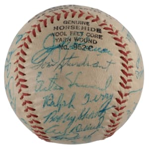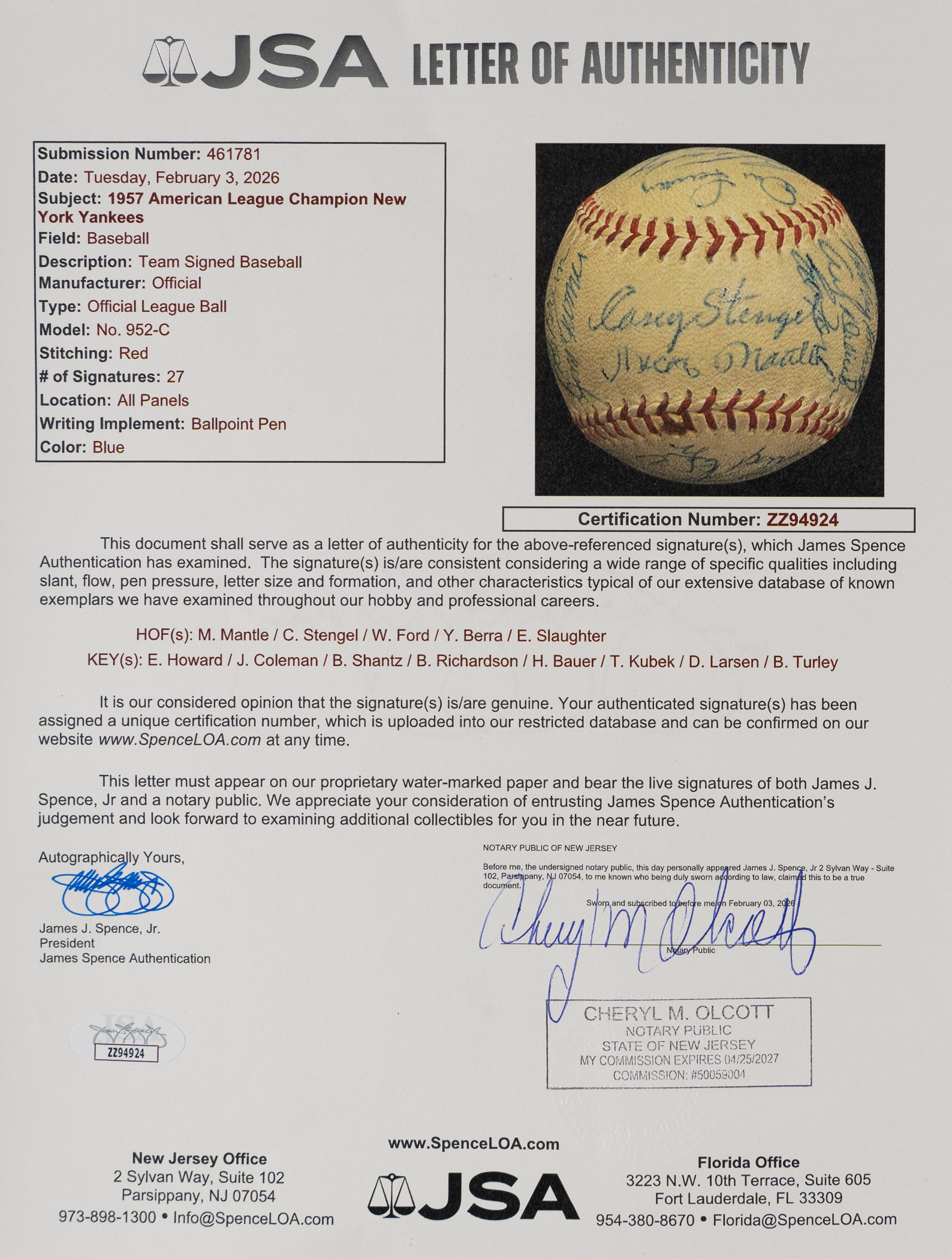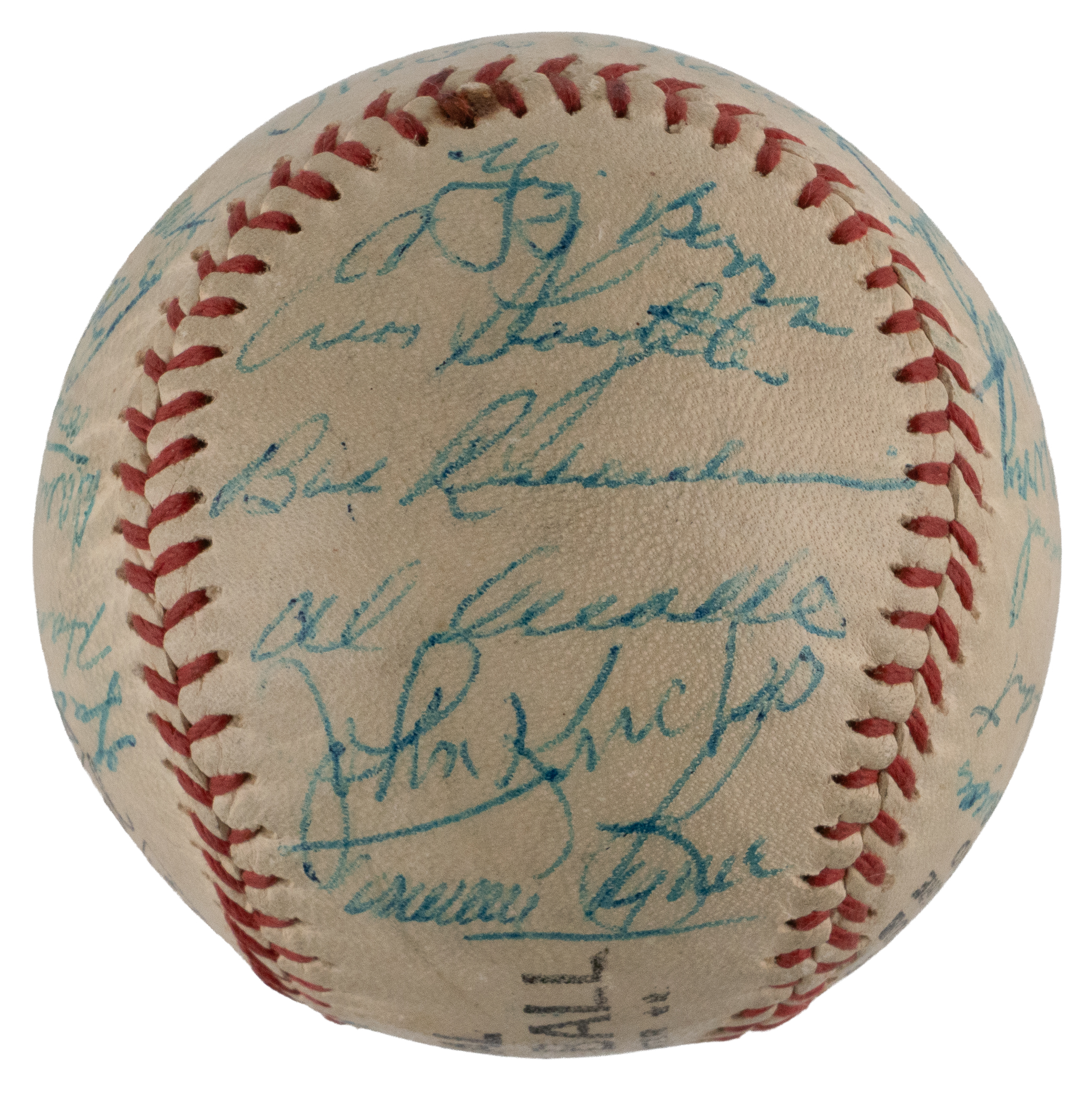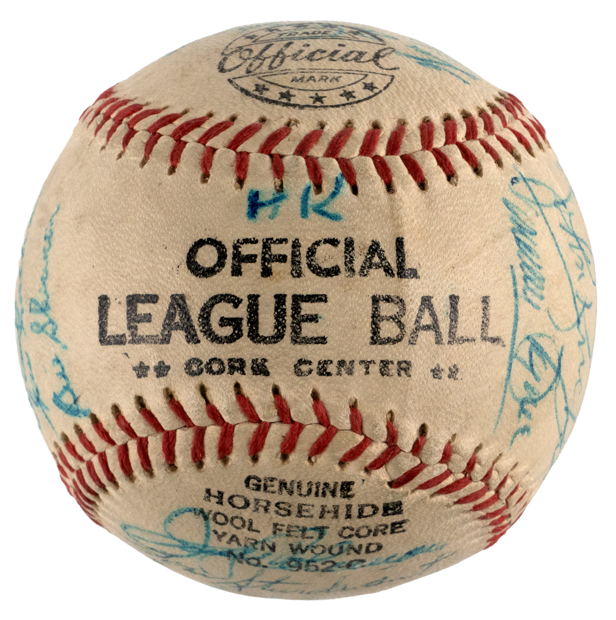 Capture the 23rd New York Yankees team to win the American League pennant, when you track down this 1957 Yankees team-signed baseball. A generic Official League model, this period-signed ball hosts a total of (27) signatures, including wizened manager “Casey” Stengel and 1957 AL MVP Mickey Mantle on the sweet spot. While those two names alone are worth the price of admission, this glorious ball boasts many of the other great stars of the 1950s Yankees dynasty, who were champions on multiple occasions. While the signatures have softened slightly over the seventy years since they were applied to this vintage orb, all retain sufficient integrity to be easily recognized.