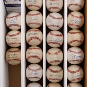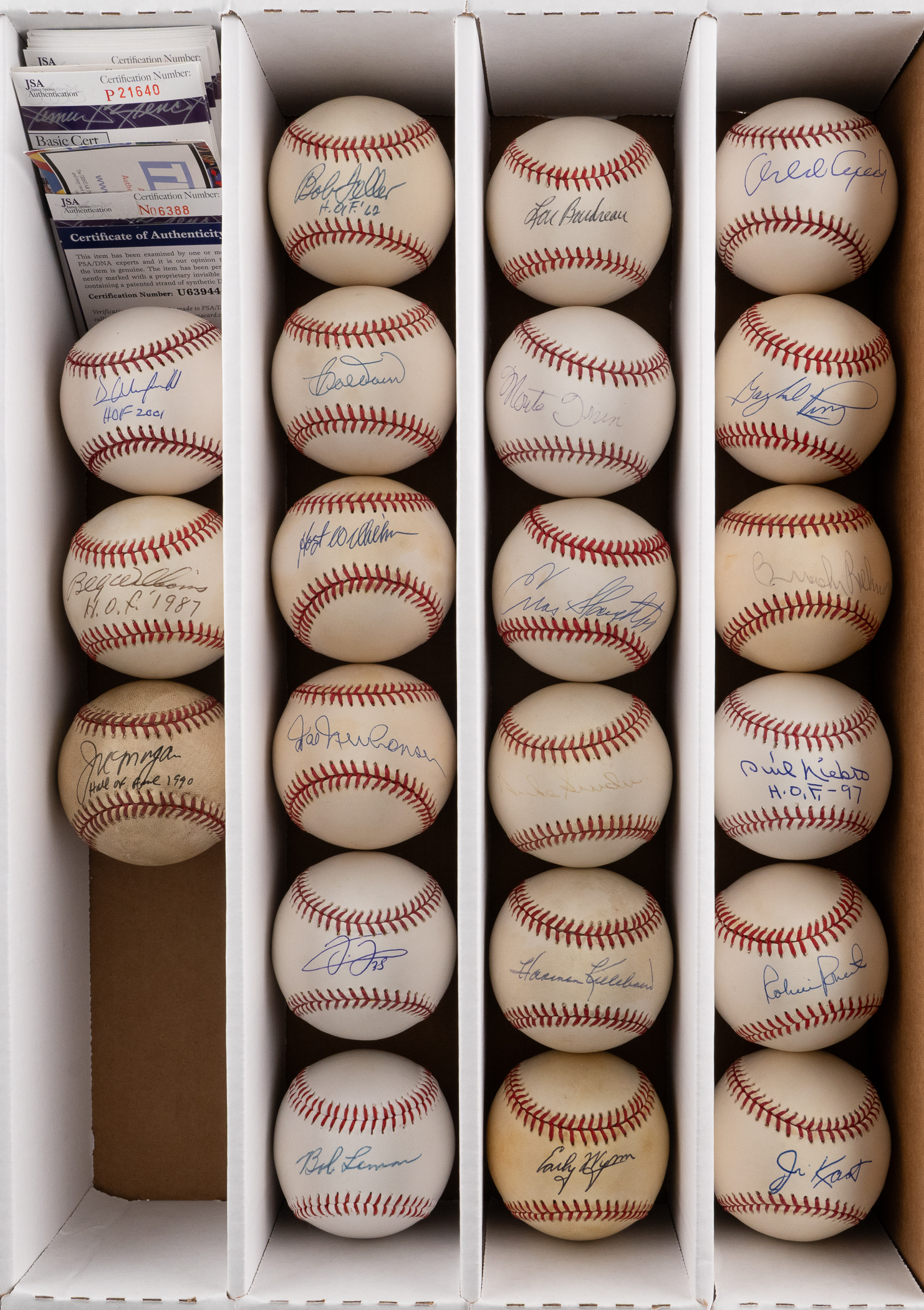 Nolan Ryan, Earl Weaver, Stan Musial “HOF 69,” Whitey Ford, Frank Robinson, Ernie Banks, Frank Thomas (Schwarz Sports Cert), Johnny Bench “HOF 89,” Bob Feller “HOF 62,” Dave Winfield (Steiner Sticker), Tom Lasorda “HOF 8-3-97,” Rod Carew (PSA Sticker only), Bob Doerr, Hoyt Wilhelm, Hal Newhouser, Billy Williams “HOF 1987,” Joe Morgan “Hall of Fame 1990,” Bob Lemon, Lou Boudreau, Monte Irvin, Enos Slaughter, Duke Snider, Harmon Killebrew, Early Wynn, Brooks Robinson, Orlando Cepeda (Tri-Star & MLB Holo), Gaylord Perry, Phil Niekro “HOF–97” (Tri-Star), Jim Kaat, Robin Roberts.