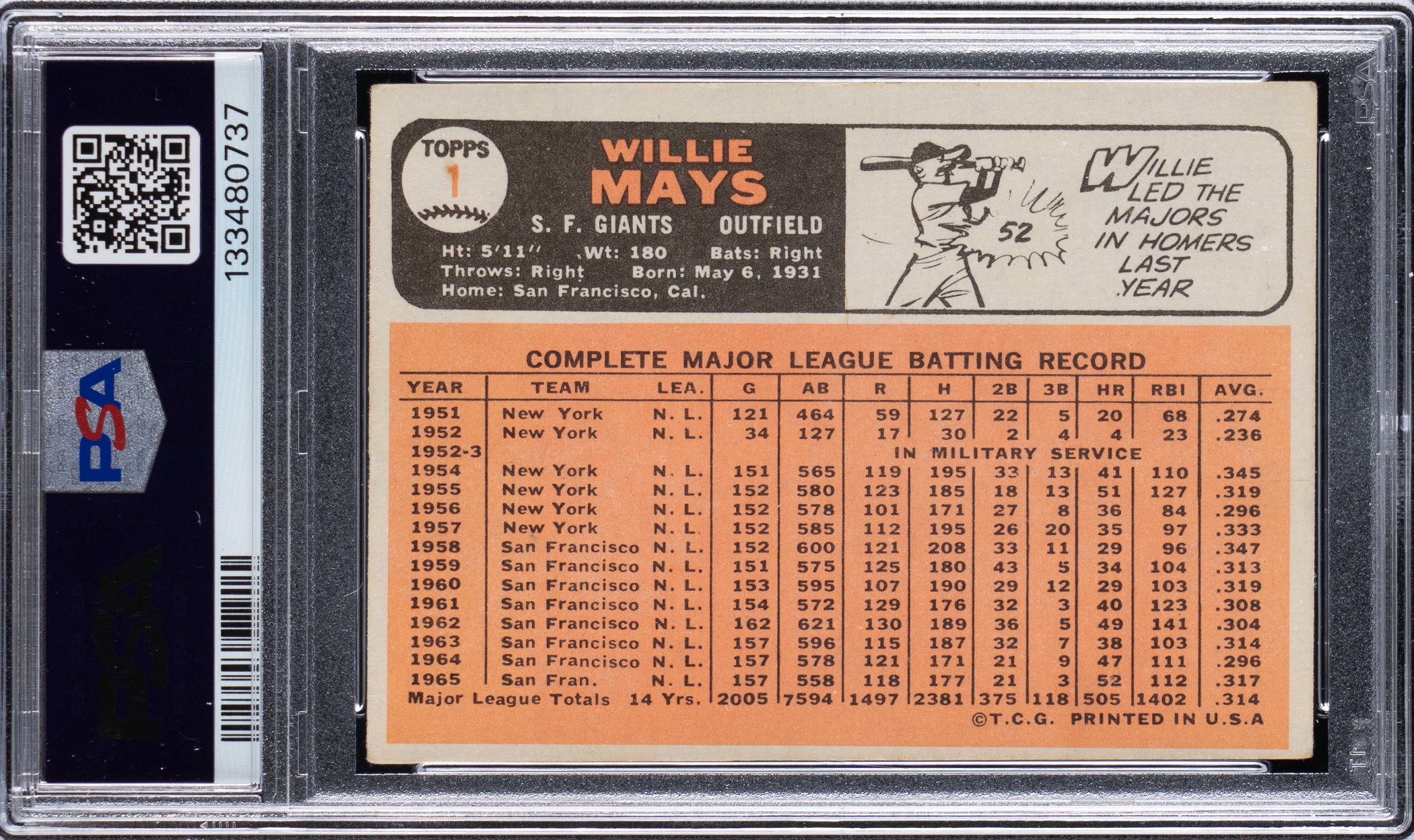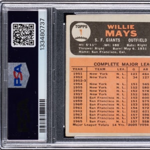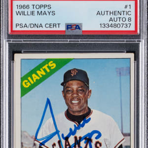 Signature judged by PSA/DNA, encapsulated, and awarded an "8" Auto grade. Bold 1966 Topps #1 Willie Mays signed card. The blue Sharpie signature is accurately placed near the San Francisco Giants Hall of Famer's midsection. The surface presents mid-grade with only moderate perimeter wear.