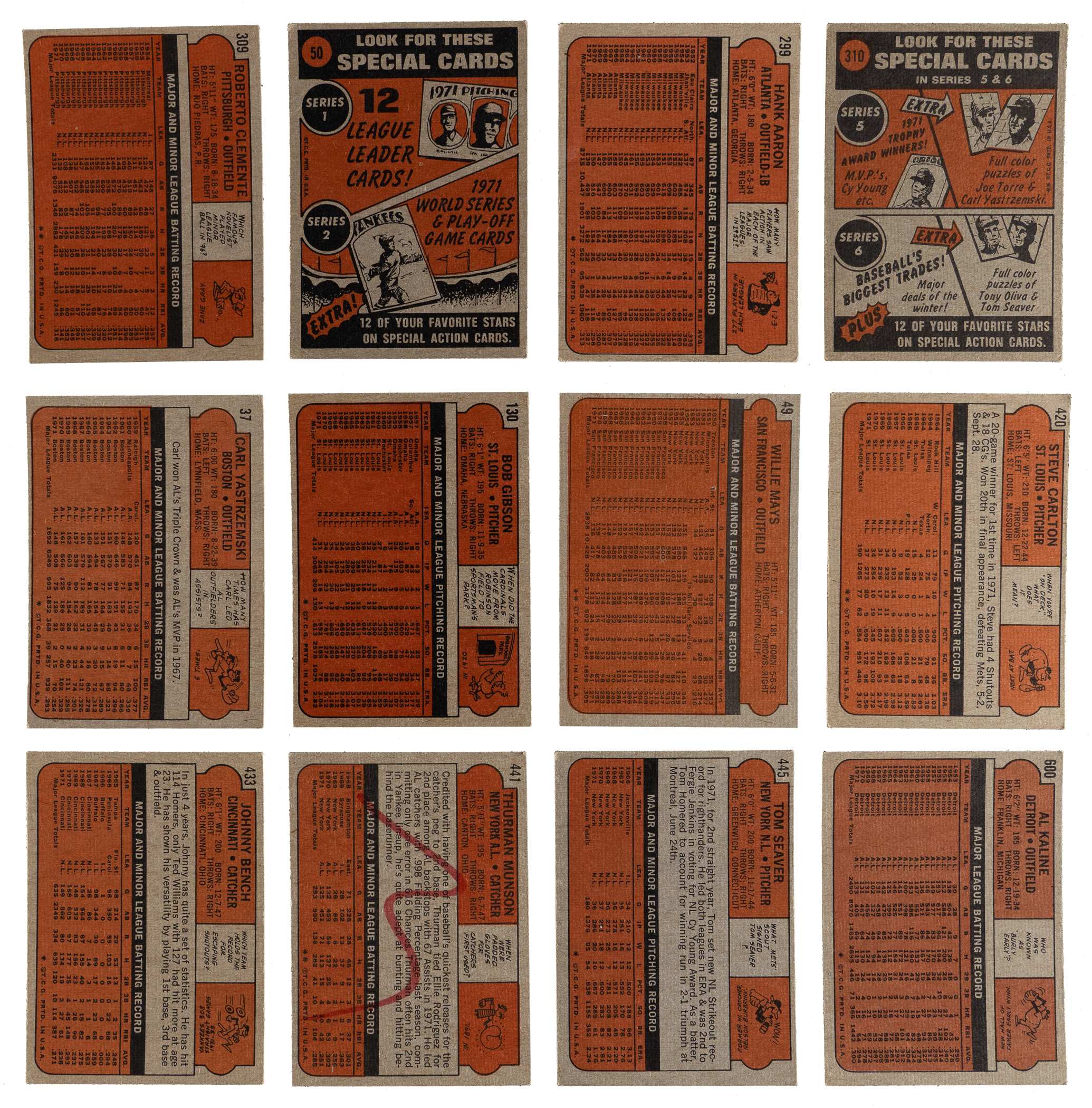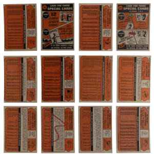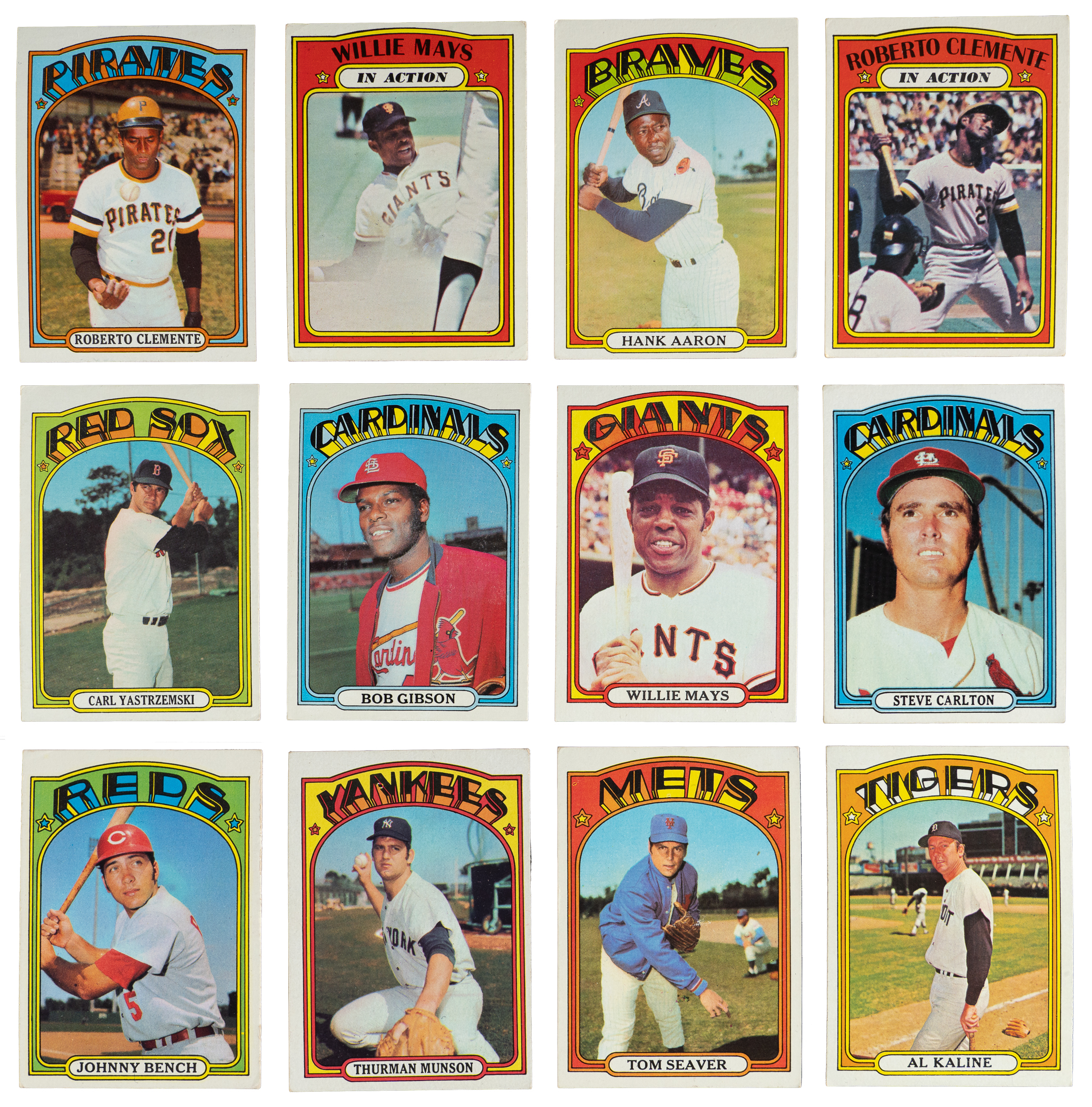 Zone in on the offered 1972 Topps partial set of (621/787) cards featuring several key cards and (32) tougher high numbers (average VG-EX to EX). This crisp compilation generally presents in the (EX to EX-MT) range with nearly 20% displaying reverse writing. Keys include: #37 Yastrzemski (EX), #49 Mays (EX), #50 Mays IA (VG), #79 Fisk/Cooper RC (PR, reverse writing), #130 Gibson (EX-MT), #299 Aaron (VG), #309 Clemente (EX-MT), #310 Clemente IA (VG), #420 Carlton (VG), #433 Bench (GD), #441 Munson (PR, reverse writing), #445 Seaver (VG-EX), #600 Kaline (VG-EX) and #668 Rangers Team (VG-EX).