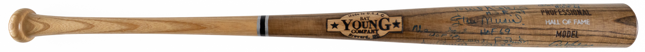 This 33-inch Young Bat Company, Brevard NC, Professional Hall of Fame Model bat has been signed by (9) Hall of Famers who have also inscribed their Hall of Fame induction year. Signatures and inscriptions average (“6 to 8”).