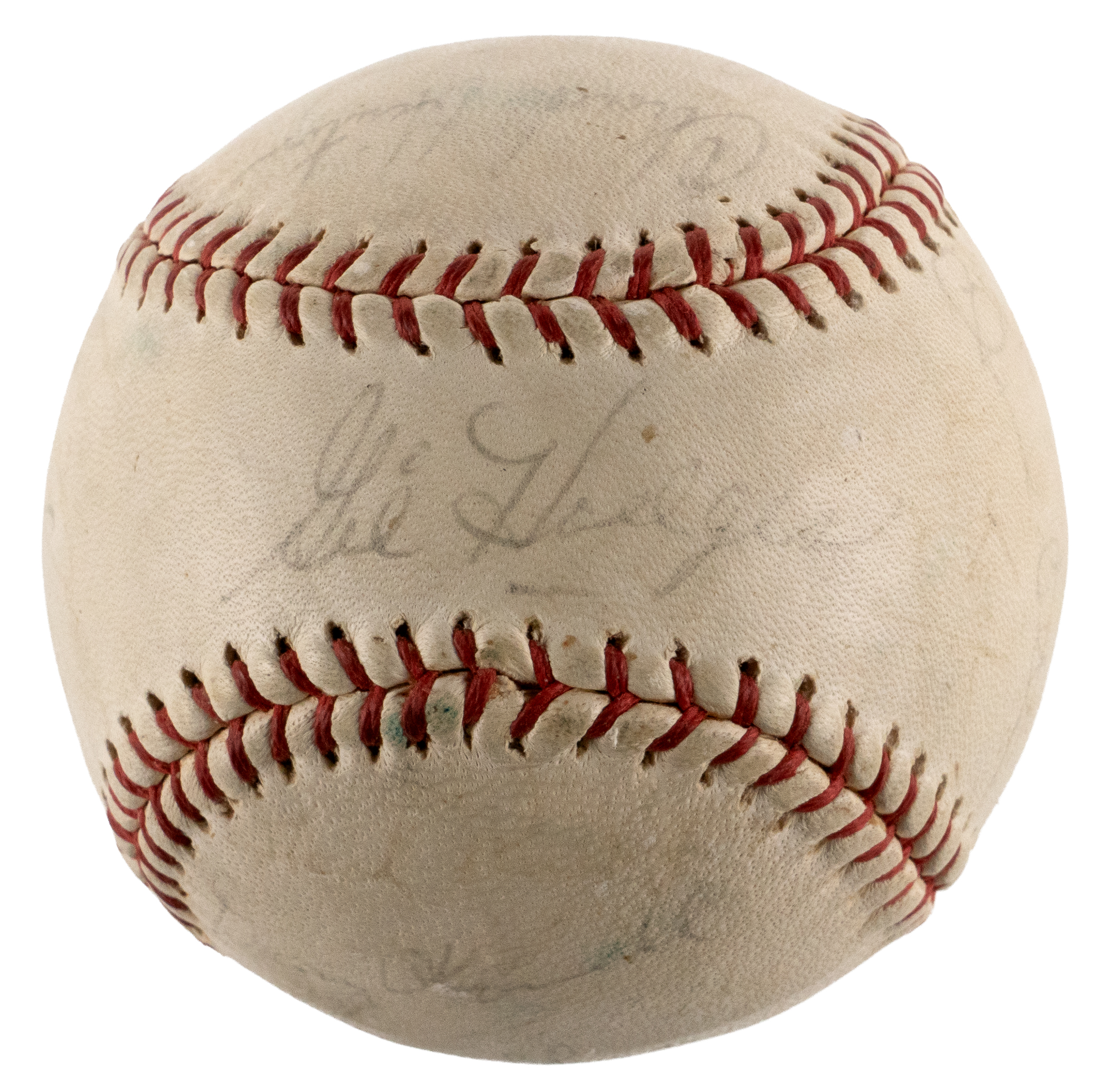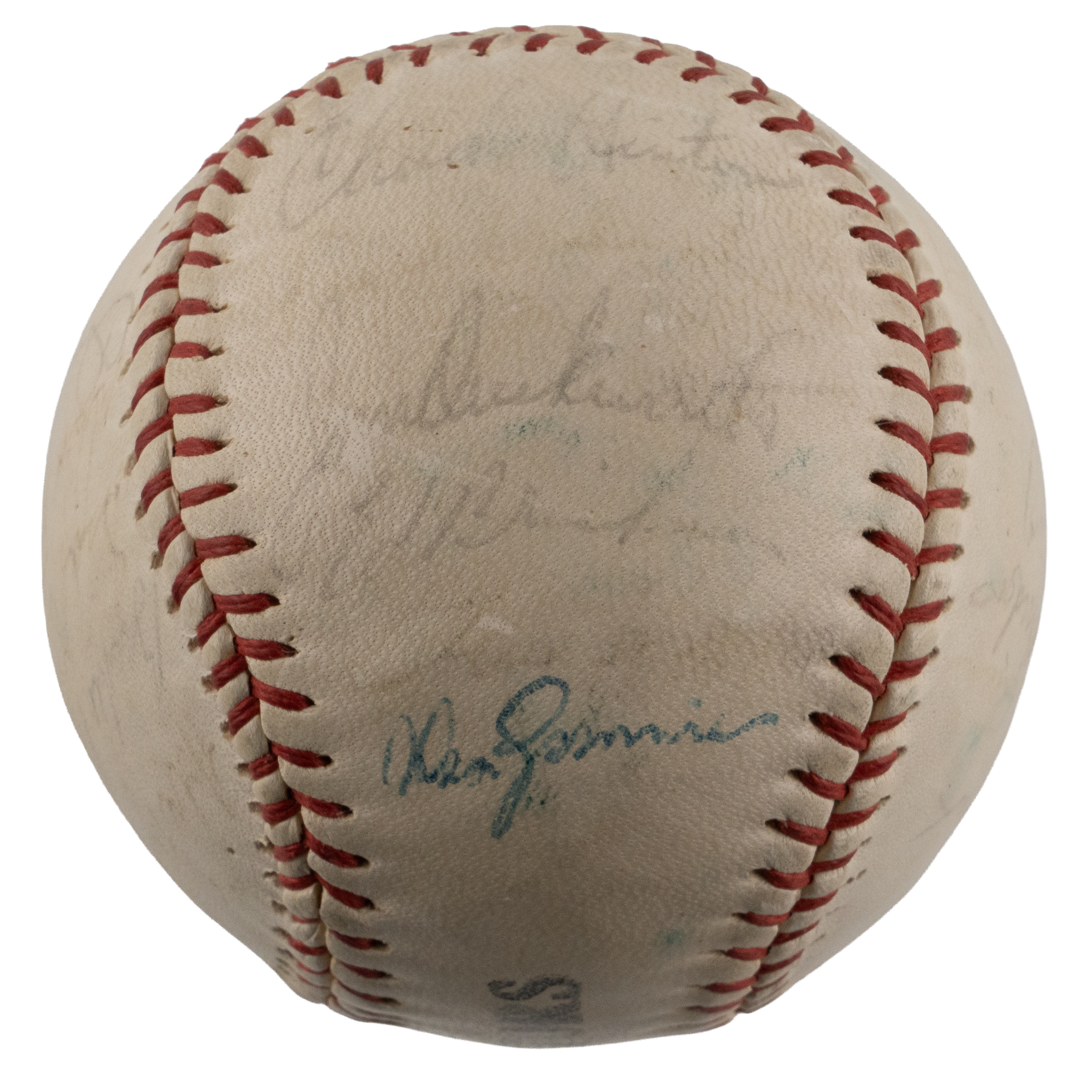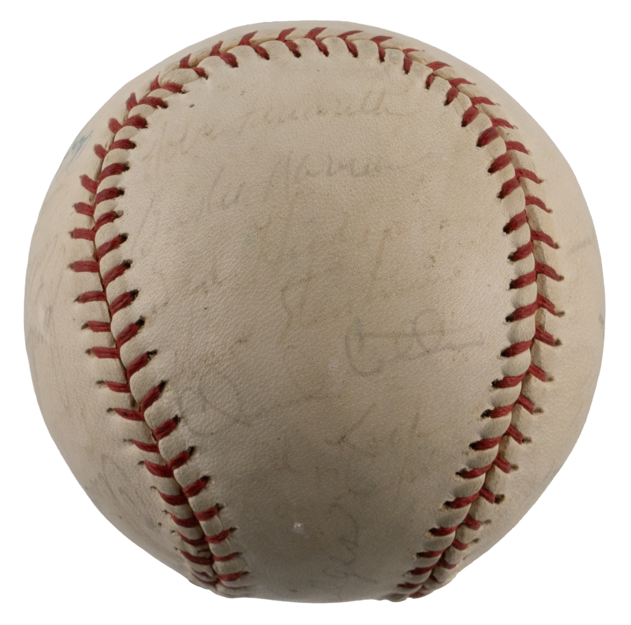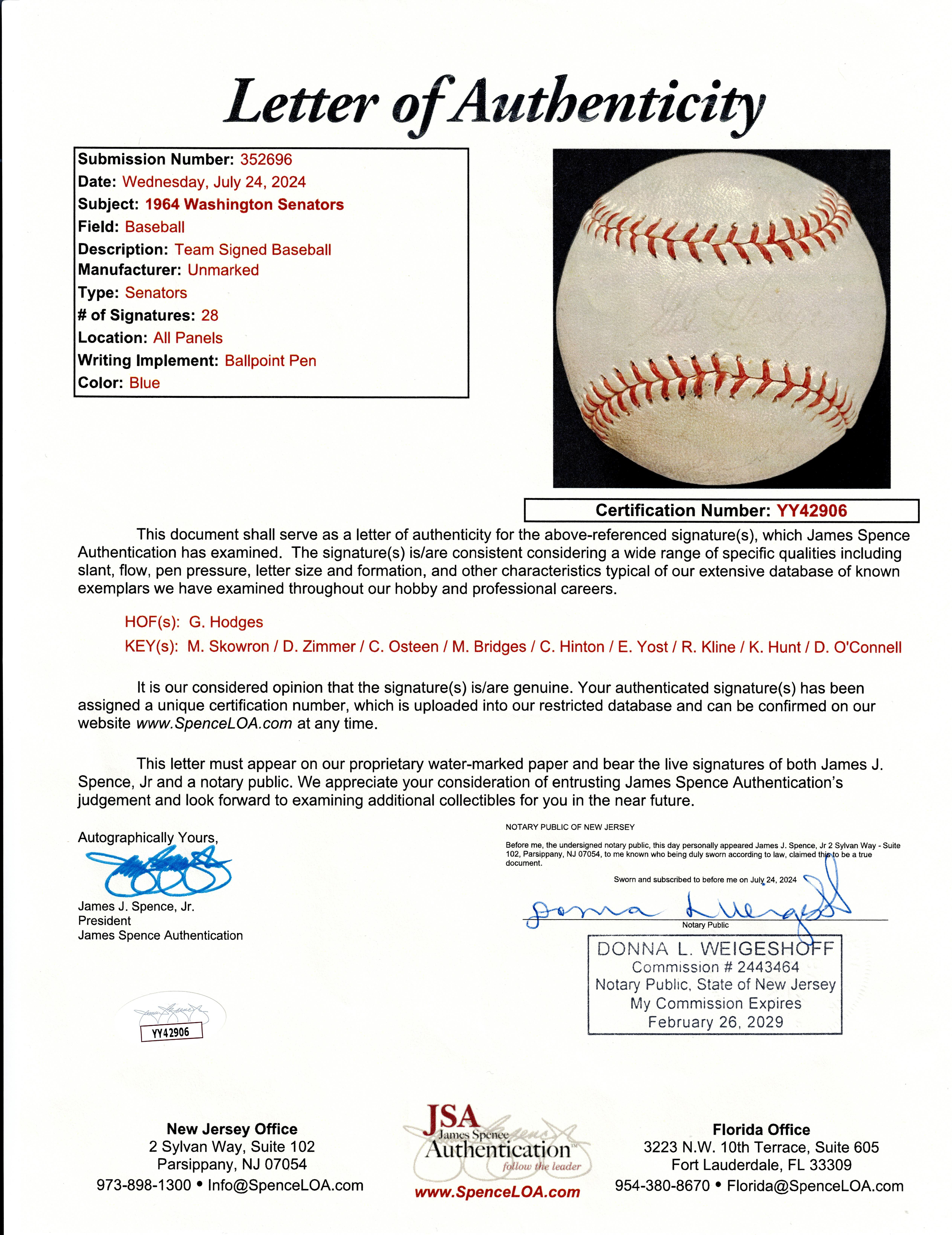 In 1964, the Washington Senators moved up a notch in American League pecking order, climbing from a dead last tenth place finish in 1963, to ninth place in 1964. The bright spot for this expansion club was their manager, future Hall of Famer Gil Hodges. A total of (28) members of the 1964 Senators squad are counted on the offered team-signed baseball, including Hodges. A souvenir model stamped with "Senators", this period signed ball retains decent labeling integrity. While most of the signatures are faint, fate has been kind to the Hodges sweet spot autograph, which shows as one of the three most prominent signatures, along with Don Zimmer on the north panel, and Bill Skowron on the south panel.