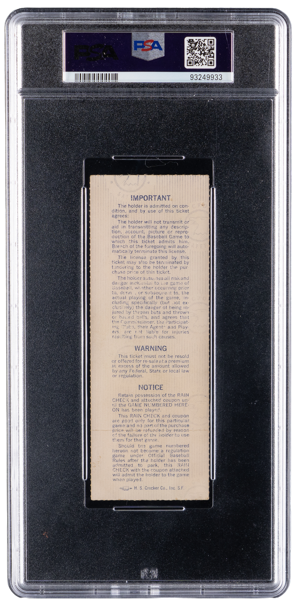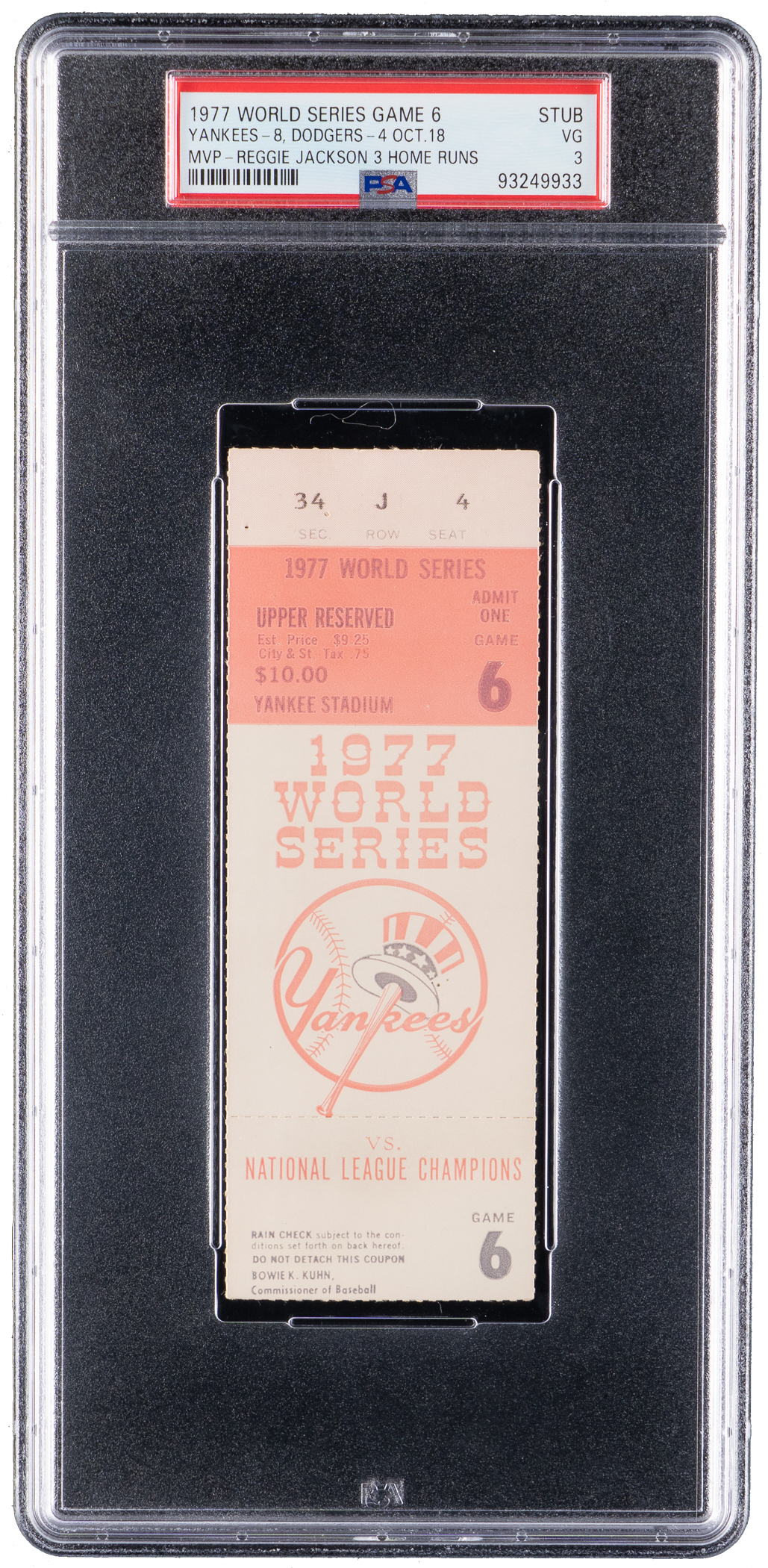 One of the most memorable games in all of baseball's long history is recalled, with the offering of this 1977 World Series Game 6 ticket stub. The date was October 18th, the venue was Yankee Stadium, the competing teams were the New York Yankees versus the Los Angeles Dodgers, and the hero was Reggie Jackson, who belted three home runs in this Game 6 series clincher, each at the expense of a different Dodgers pitcher. In all, Jackson hit five homers in this six-game series to earn both MVP honors, and his famous nickname "Mr. October". PSA has encapsulated this big game ticket stub with a grade of VG 3.