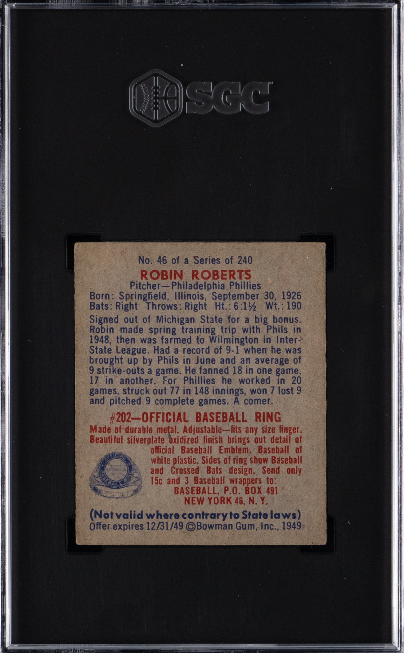Graded EX 5 by SGC. The frontline Philadelphia Phillies Hall of Fame ace delivers on the offered 1949 Bowman #46 rookie card. This action pose displays four sharp corners, crisp off-white edges and electric surface colors. The gray reverse is wax-stain free and amplified by bold red-and-blue advertising text.
