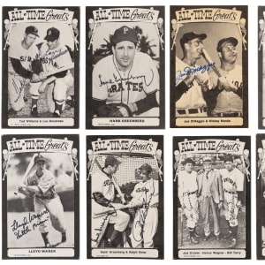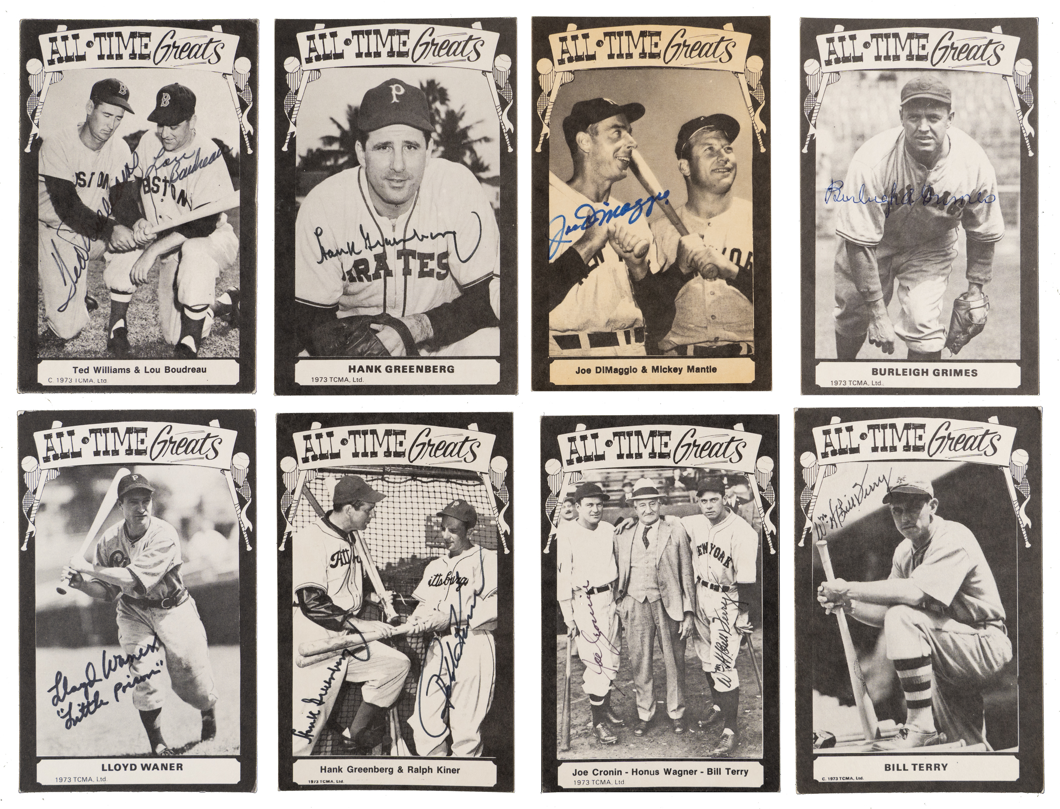 Make your collection great again, when you add this bundle of (31) signed 1973-1980 TCMA All-Time Greats postcards. With (3) dual-signed cards in the mix, the signature total is tallied at (34). Averaging Vg to Ex+ quality, these vintage cards host generally satisfying signatures. The roster of featured subjects is truly impressive, with elites such as Ted Williams, Joe DiMaggio and Hank Greenberg leading the way.