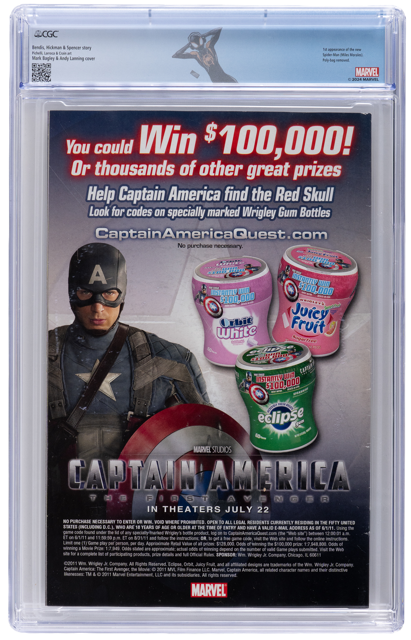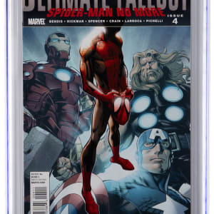 Marvel Comics "Spider-Verse" welcomed a crowd-pleasing addition, with the introduction of Miles Morales in this 10/11 Ultimate Fallout #4 issue. This new Spider-Man character has proven a big hit, and this debut issue ranks high on the most wanted Modern Age comics list. The leap to big screen animated adventures gave the Miles/Spider-Man character, and the Spider-Verse in general a big lift, and here's your chance to get in on the action. CGC has rated this nicely preserved example 9.0, White Pages. Label notes are "Bendis, Hickman & Spencer story, Pichelli, Larroca & Crain art. Mark Bagley & Andy Lanning cover. 1st appearance of the new Spider-Man (Miles Morales). Poly-bag removed.".