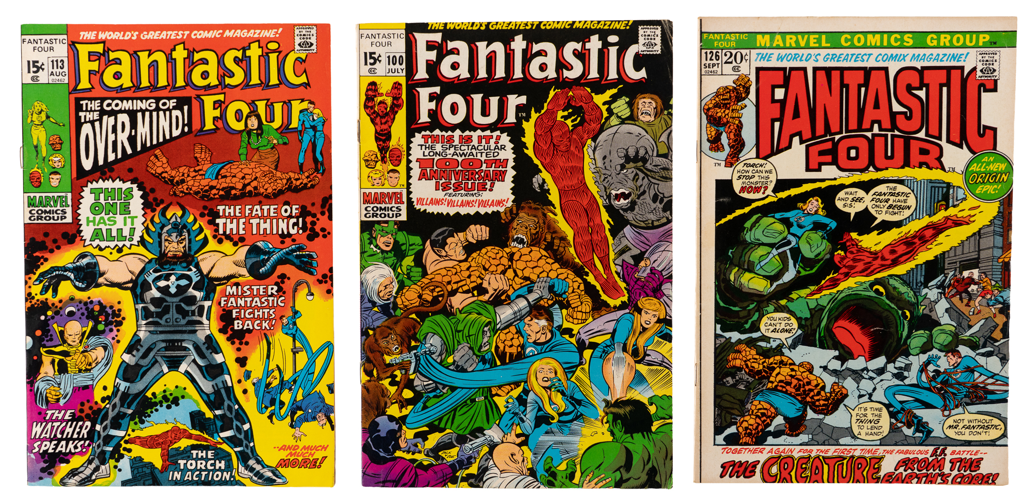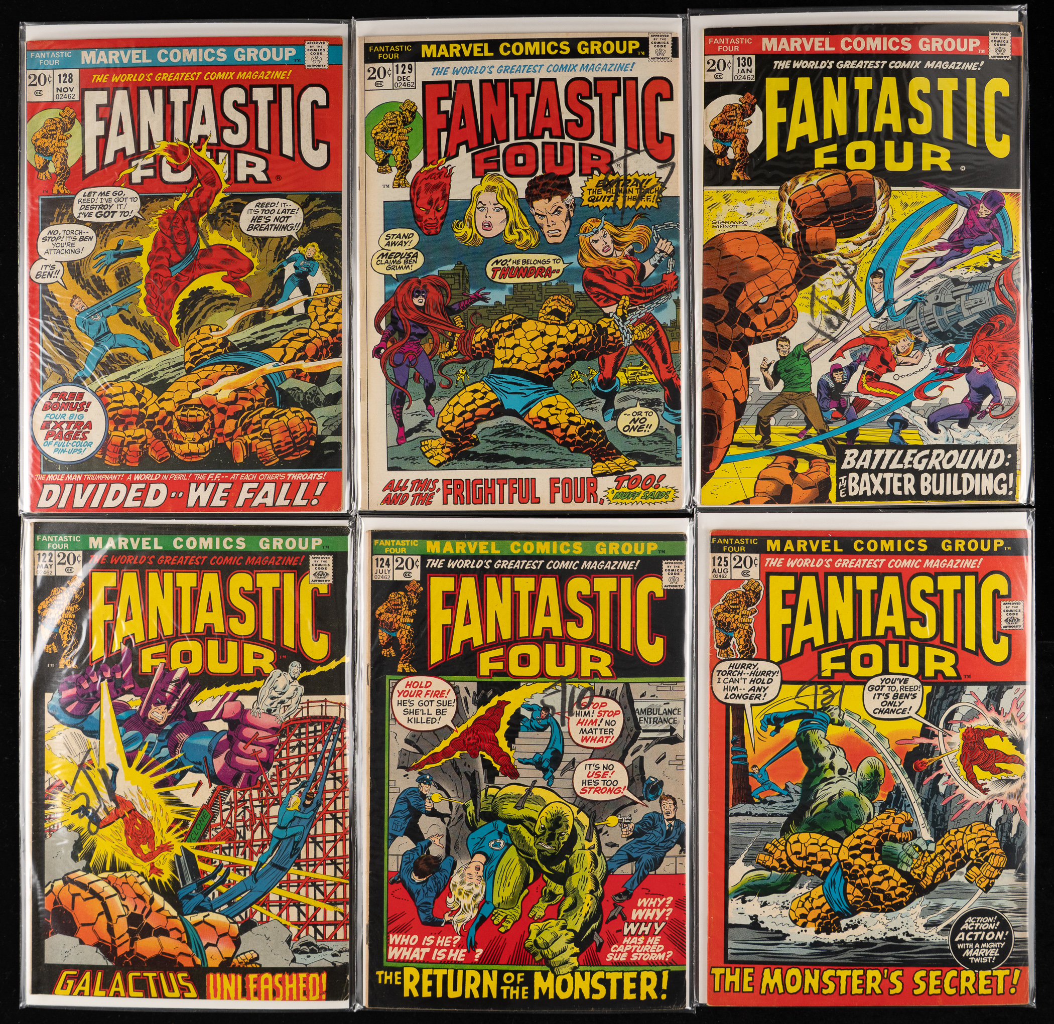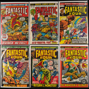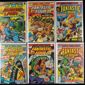 The iconic team that got the ball rolling for Marvel Comics great super-hero surge is spotlighted, with the presentation of this 1970-1979 Fantastic Four #100-202 near-complete run with (80/103) issues. Introduced in 1961, the FF paved the way for Marvel's first generation of heroes, including the Avengers, Spider-Man, Daredevil, Hulk, the X-Men and plenty of other fan favorites. Starting with the July 1970 issue #100, and ending with the January 1979 issue #202, this collection represents approximately 80% of all Fantastic Four issues published during the defined date range, accounting for a big chunk of the beloved team's Bronze Age adventures. Condition is favorable throughout ranging FN to NM, with deference to 25% bearing written arrival dates on the front covers.