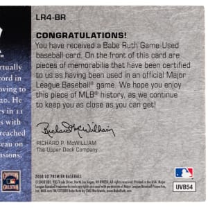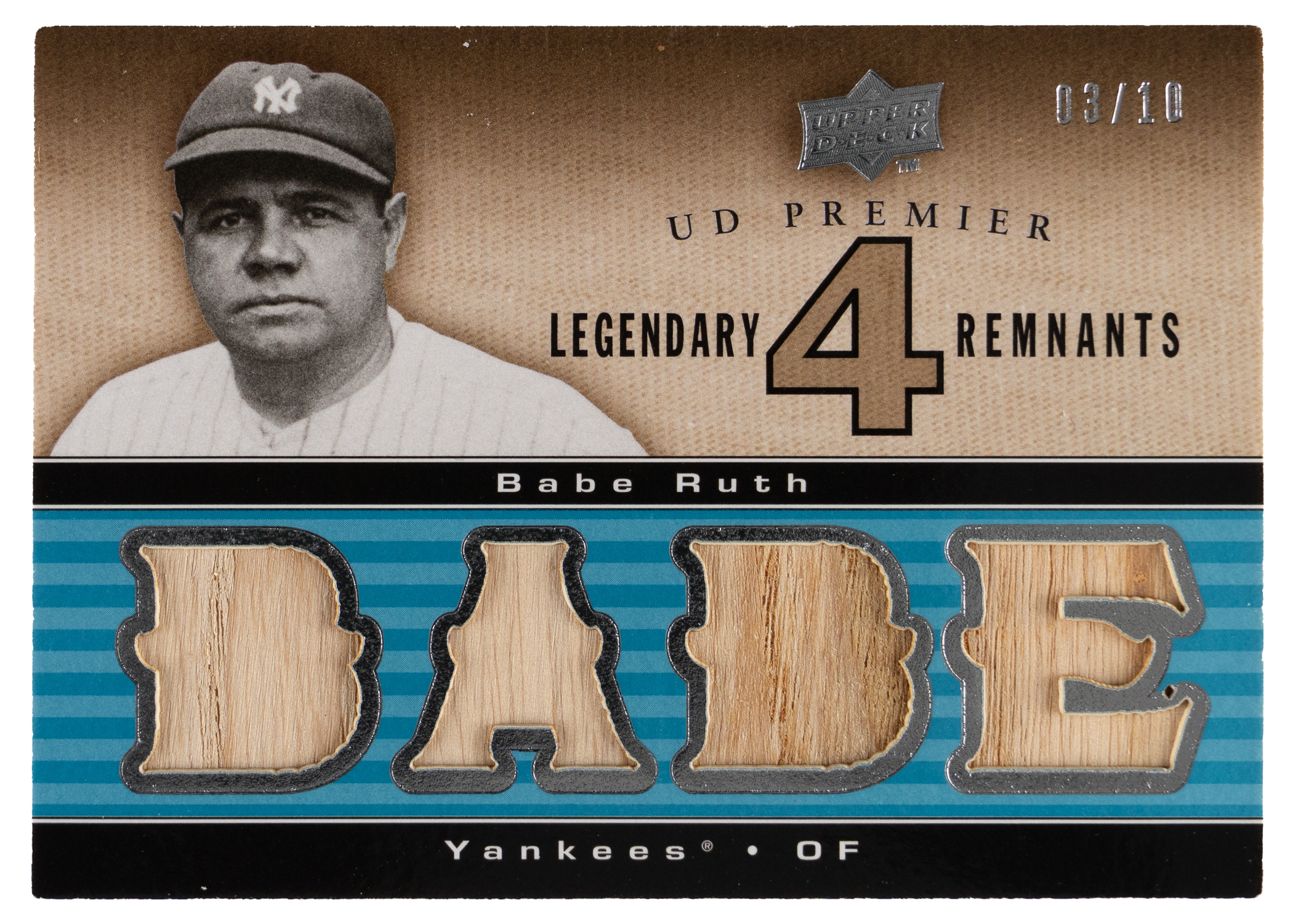 Matches Jersey Number! Serially numbered #3/10. Impressive 2008 Upper Deck Premier Babe Ruth game-used bat card. This "Legendary Remnants" parallel features four slices of Ruthian lumber embedded in a "Babe" design scheme. One of the more desirable cards of the New York Yankees Hall of Fame slugger seeded across the production line.