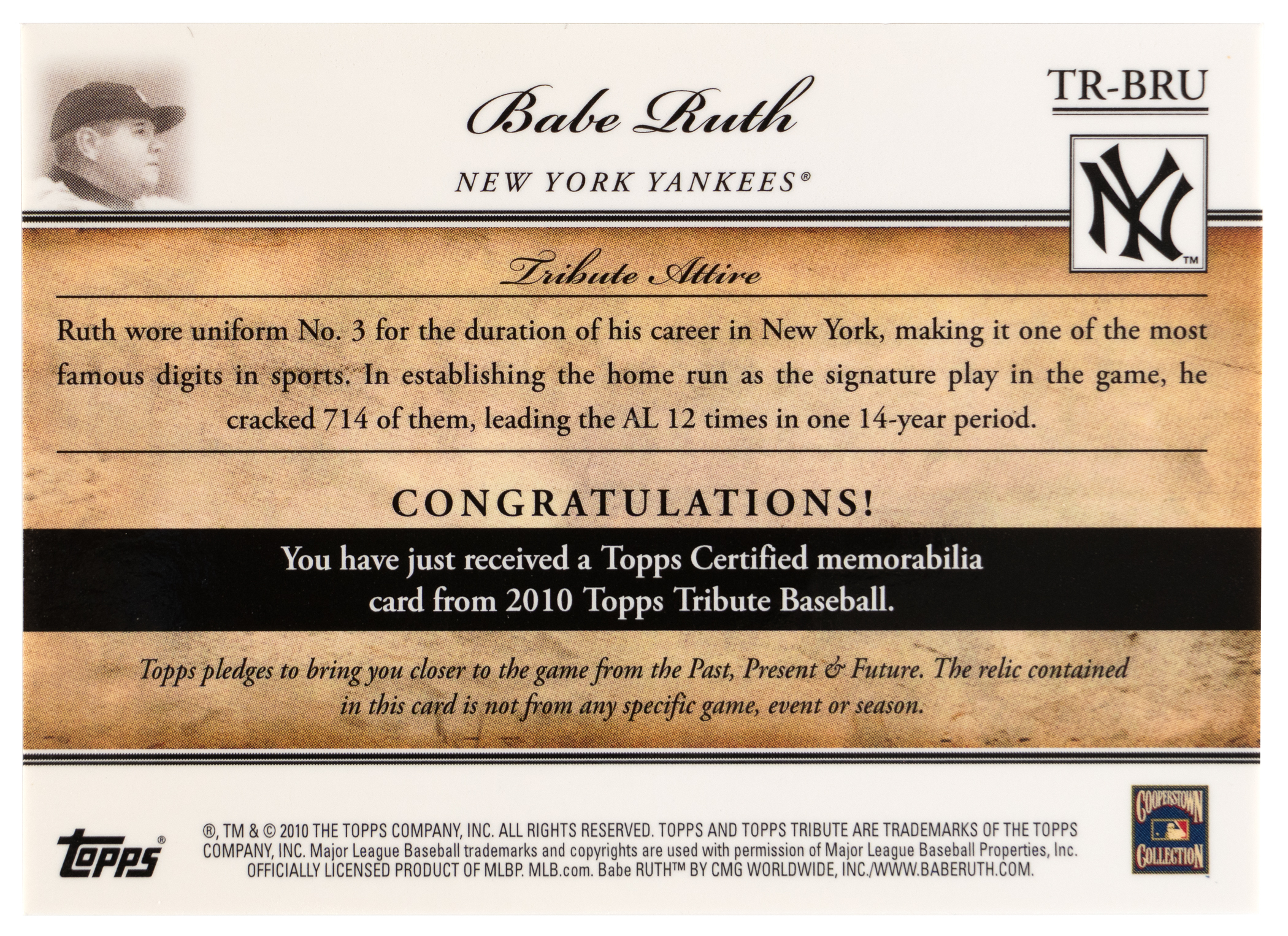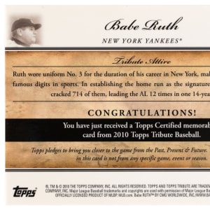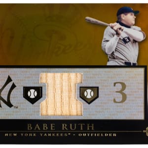 Spellbinding 2010 Topps Tribute Babe Ruth modern insert relic card. This gold parallel is serially numbered #18/25 and features a beefy chunk of lumber. A fantastic pull of the New York Yankees Hall of Famer from the high-end product line.