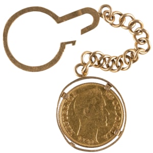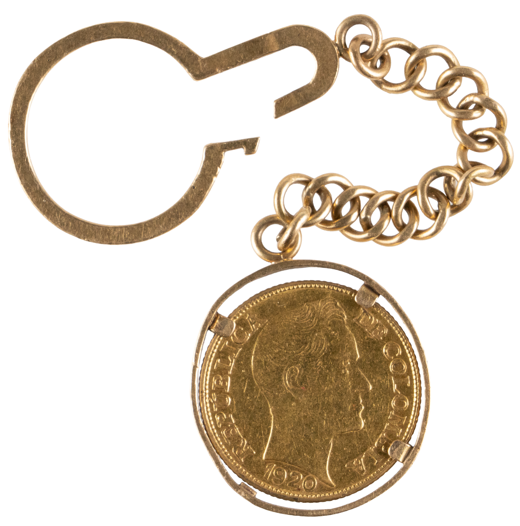 Simon Bolivar never looked so good as he does on the obverse of this 1920 Colombia 5 Pesos gold coin set in a watch fob chain. A few decades after U.S. Independence was achieved, Bolivar led the successful revolt against Spain, in what are now the South American nations Venezuela, Colombia, Ecuador, Peru, and Bolivia, with the latter country named after him. Fronted by this driven statesman, this antique coin reports in XF-AU condition, with appealing detail integrity, and decent luster. Stated on the reverse are a "B" mintmark, the coin’s weight of 7.988 grams, and its gold purity composition of 0.916-2/3, equaling 91.667%. The actual gold content of this coin is .2355 of an ounce. While the chain and setting are unmarked, they have acid tested positive for 14K gold. The total weight for the coin, chain and setting is 16.6 grams. Subtracting the weight of the coin indicates the chain and setting weigh approximately 8.5 grams. Conquer your gold craving with the acquisition of this handsome coin from South of the Border.