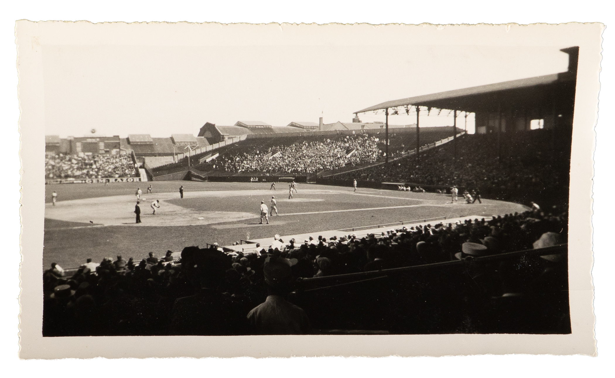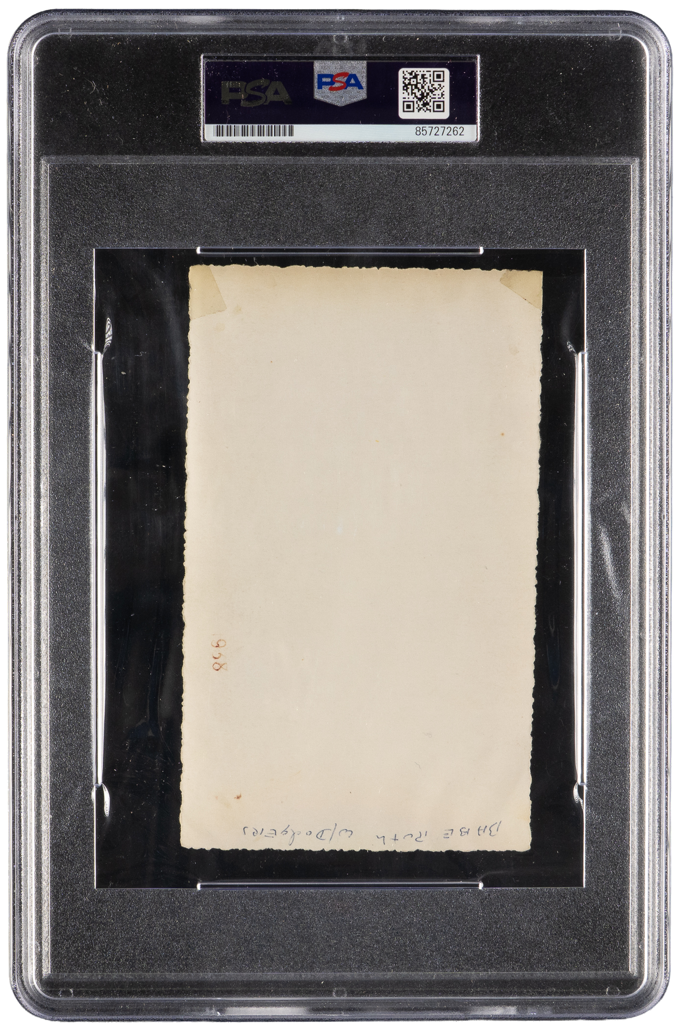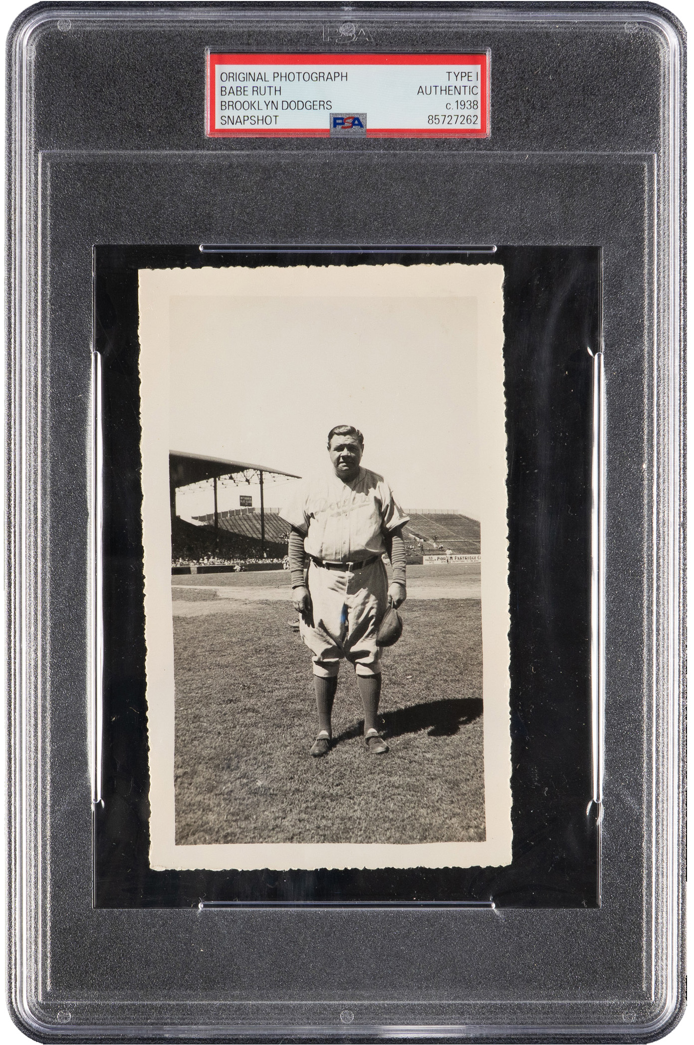 This might be a one-of-a-kind photo of the great Babe Ruth. These two photos were taken at the same time. They are both original Type I snapshots. The photo of Babe Ruth in his final years with the Brooklyn Dodgers, circa 1938, has been encapsulated by PSA/DNA. “Babe Ruth w/Dodgers” has been written on the back. The photo of Ebbett’s Field has “Ebbett’s Field Brooklyn” written in the same handwriting on the back. It appears that Ruth might be at bat in the photo. Both photos are in Excellent condition.
