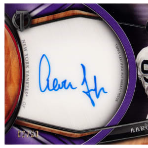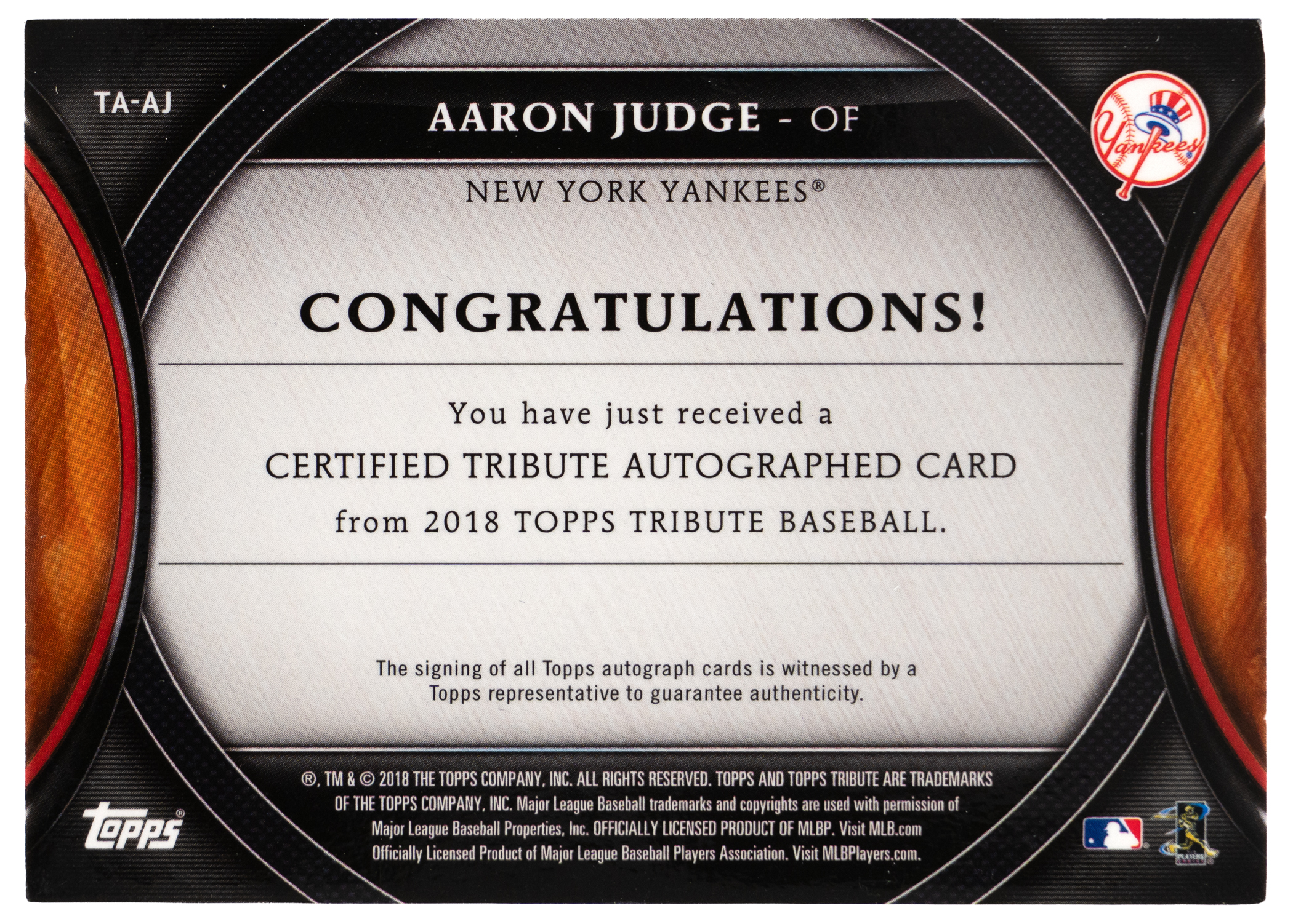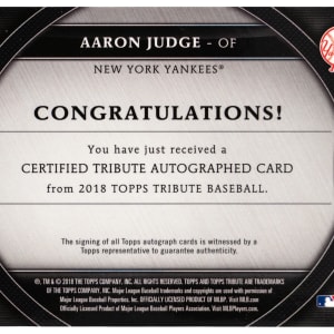 Serially numbered #02/50. New York Yankees superstar slugger Aaron Judge puts pen to canvas on the offered 2018 Topps Tribute certified autograph modern insert. This "on card" purple parallel is of the away jersey pose variant.
