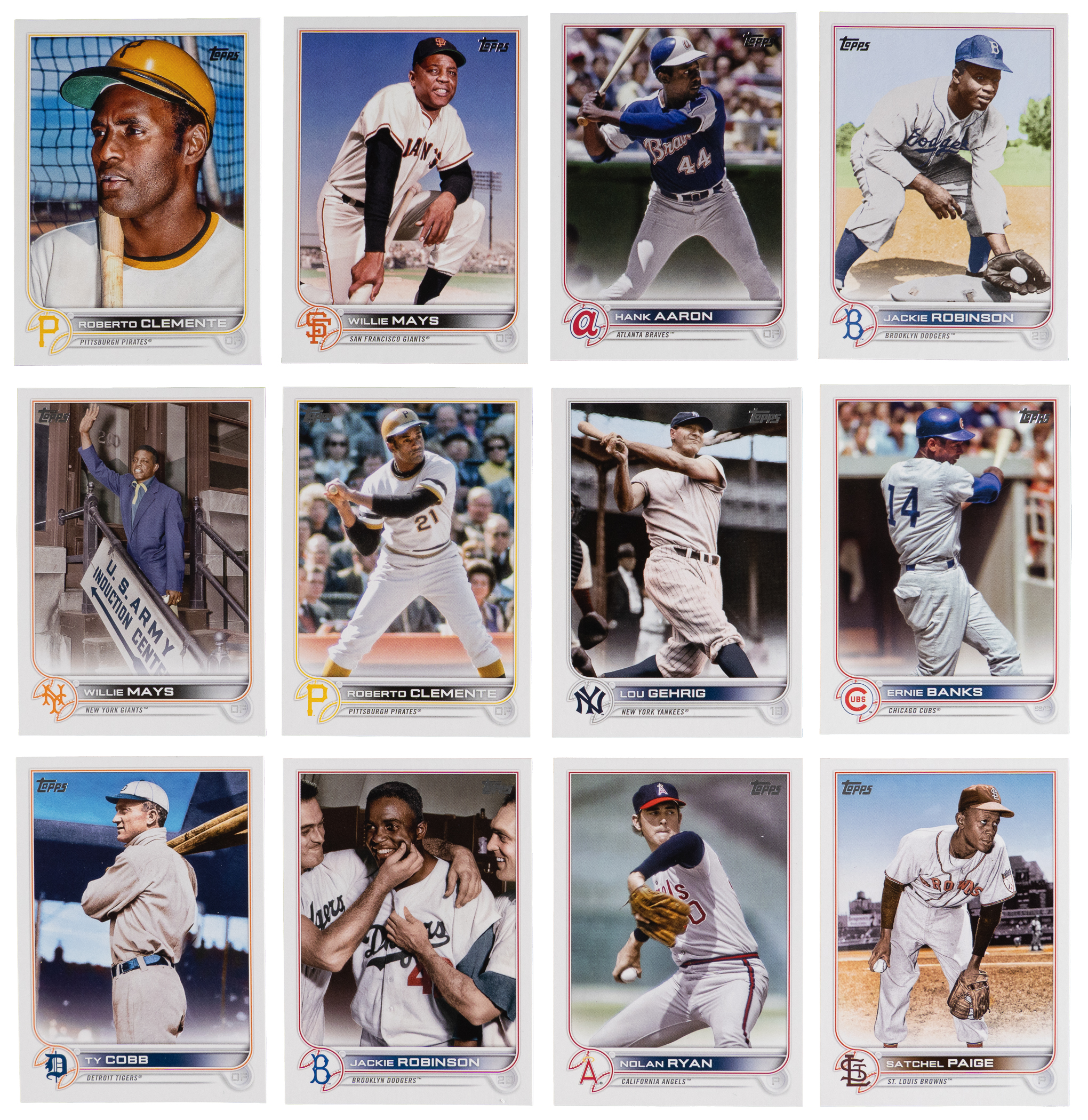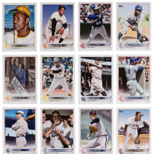 Only the "best of the best" are found in the offered 2022 Topps Legends variations near complete set of (57/65) cards. Features shortprinted Hall of Famers and stars from both the flagship and Updates product lines. Includes: #4 Gehrig, #42 J. Robinson, #233 Aaron, #246 Mays, #285 Clemente, #354 Schmidt, #356 Yastrzemski, #372 F. Thomas, #375 Piazza, #415 Murray, #440 Gwynn, #445 Mattingly, #448 F. Robinson, #453 Puckett, #466 Sandberg, #483 B. Jackson, #485 Bench, #490 Banks, #497 Maris, #531 R. Johnson, #557 Larkin, #565 O. Smith, #582 Boggs, #589 Brett, #625 R. Jackson, #629 C. Jones, #632 W. Clark, #US4 Gehrig, #US6 Musial, #US7 Biggio, #US8 Berra, #US9 R. Jackson, #US16 B. Jackson, #US19 Yount, #US21 Clemente, #US22 Ortiz, #US24 Henderson, #US24 Mays, #US25 McGwire, #US29 Paige, #US34 Ryan, #US41 Seaver, #US42 J. Robinson, #US44 T. Williams, #US50 P. Martinez, #US60 Hornsby, #US102 Mathewson, #US134 R. Johnson, #US144 Ott, #US204 Cobb, #US214 M. Ramirez, #US235 B. Robinson, #US245 Campanella, #US253 V. Guerrero Sr., #US305 Clemens, #US311 Gibson and #US320 M. Rivera.