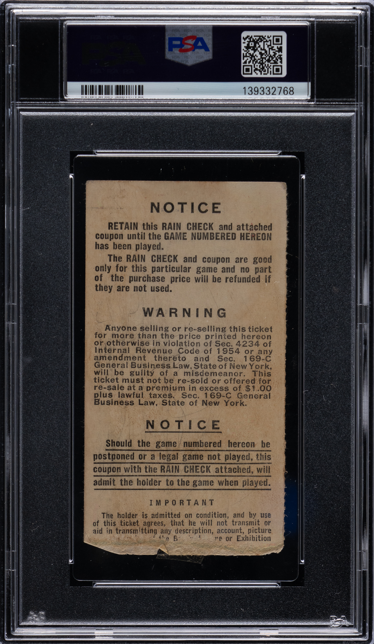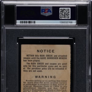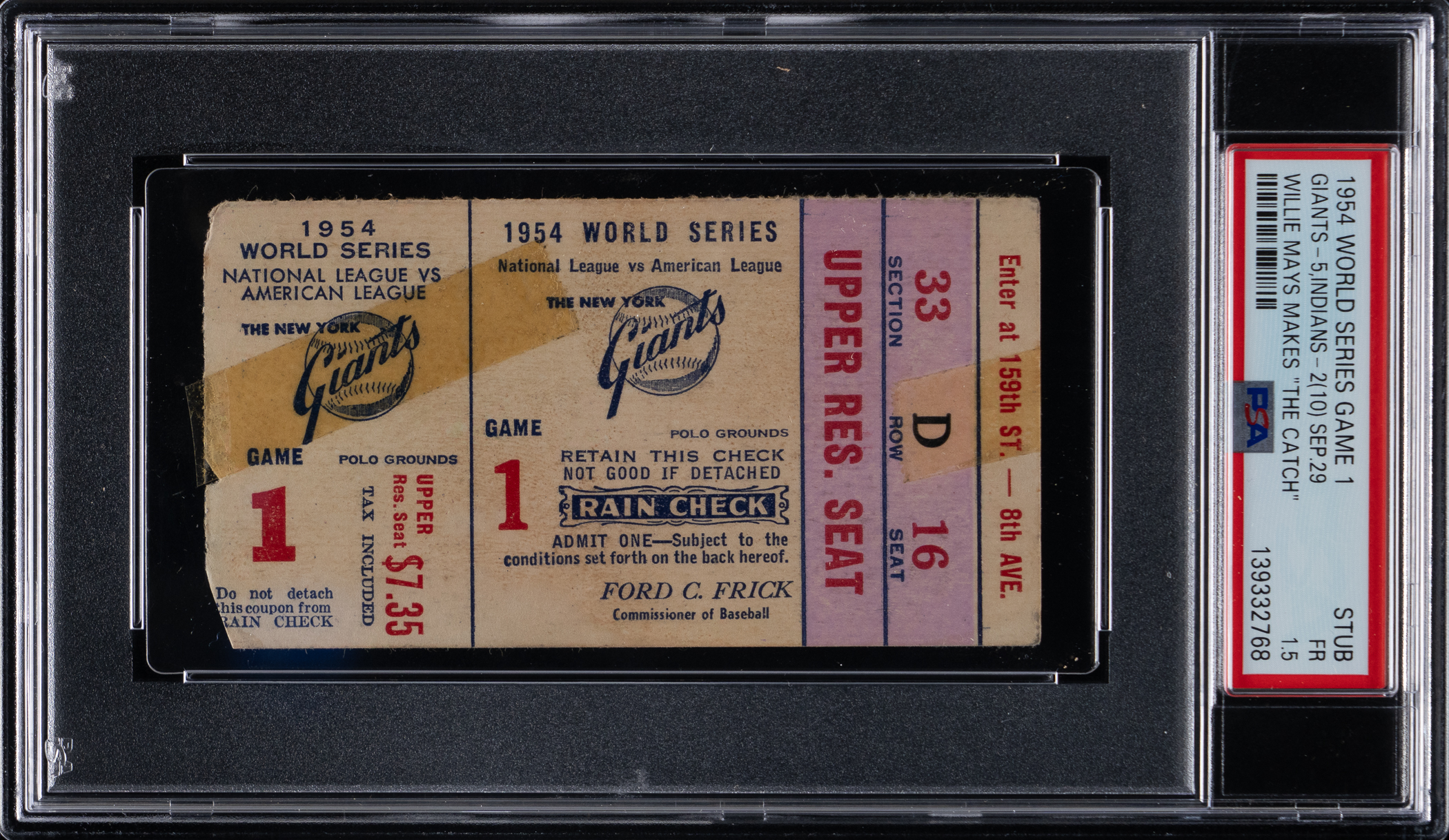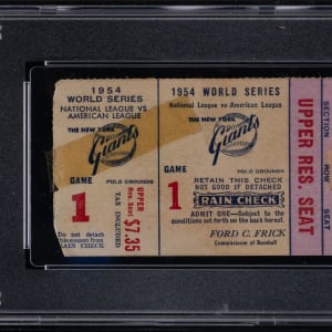 Recall one of the most exciting and memorable plays in baseball history, as you view this 1954 World Series Game 1 ticket stub. Along with 52,750 others in attendance at the Polo Grounds on September 29, 1954, the fortunate fan holding this ancient gameday souvenir got to witness "The Catch" by legend Willie Mays. The home team New York Giants were hosting the Cleveland Indians for this Fall Classic thriller. The Indians had set an AL record with a 111-win season, but the Giants served notice of their dominance with a 5-2 win in Game 1, setting the table for their four-game sweep. The game was knotted at 2-2 in the 8th. Cleveland had two men on when Vic Wertz hit a deep drive to the Polo Grounds cavernous centerfield, where Mays made an iconic over-the-shoulder catch to preserve the tie. In the bottom of the tenth, pinch-hitter supreme "Dusty" Rhodes hit a three-run walk-off homer for the Giants. This big game ticket stub is encapsulated by PSA with a grade of FR 1.5, with "Willie Mays Makes "The Catch"" noted on the label.
