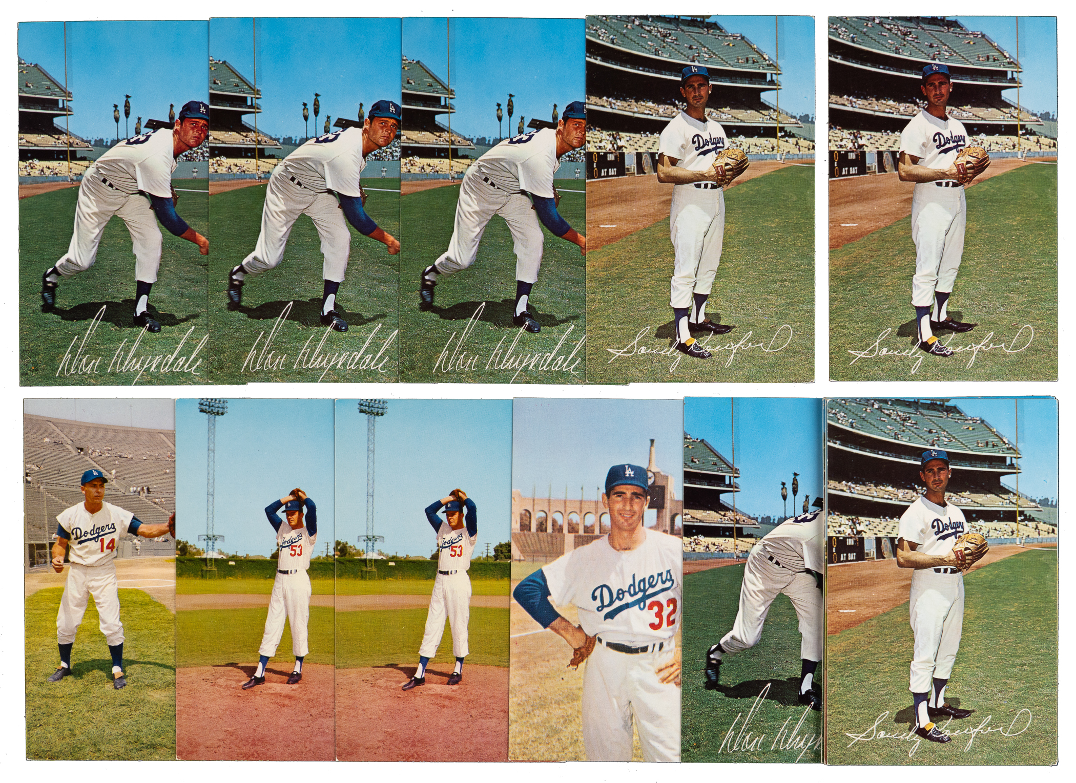 1959 Dodgers Postcards: (14 cards, average VG-EX to EX) with (4) Drysdale (one EX, one VG-EX, one VG, one FR, reverse writing), (2) Hodges (VG-EX, VG), Koufax (VG), Snider (VG-EX);