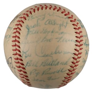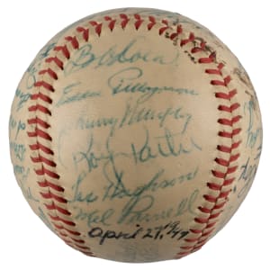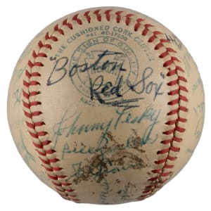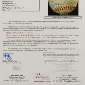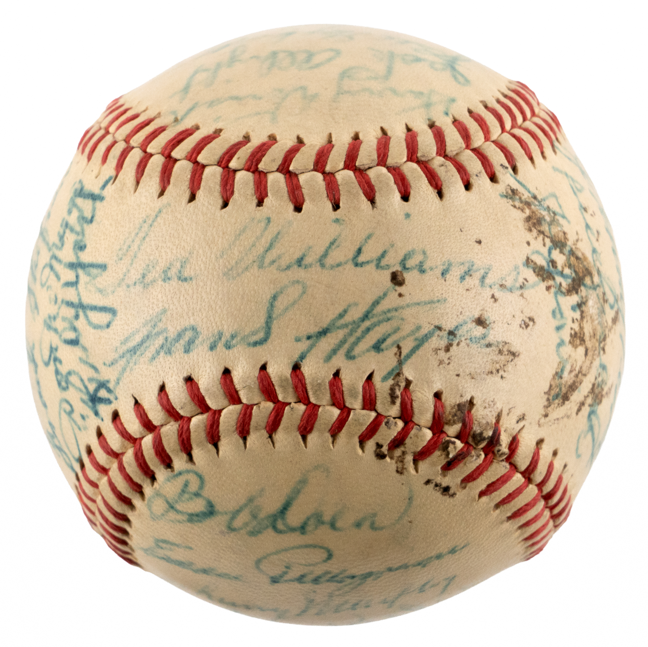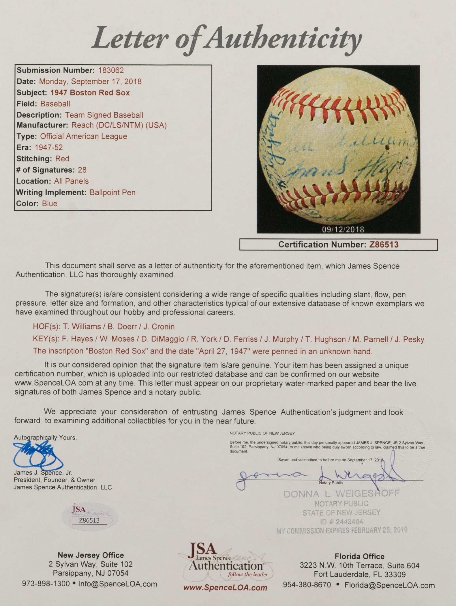 A talented 1947 Boston Red Sox squad has decorated this period signed OAL/Harridge baseball with (28) signatures. Most of the signers were members of the 1946 Sox team, that captured the AL pennant. The collecting clout is provided by Hall of Famers Ted Williams, Bobby Doerr and Joe Cronin, with strong support coming from notables Dom DiMaggio, Johnny Pesky, Wally Moses, "Tex" Hughson and Mel Parnell. Also noted are signatures from long deceased stars Frankie Hayes, "Rip" Russell, Johnny Murphy, Mickey Harris and Rudy York.