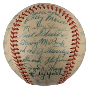 The majority of the signatures remain fairly distinct, though those located on the north panel are moderately faded, and the signatures of Bill Zuber and Joe Cronin on the east panel are partially obscured by traces of foreign matter. The baseball remains appealing despite fading of the factory labeling stamps.