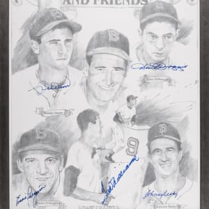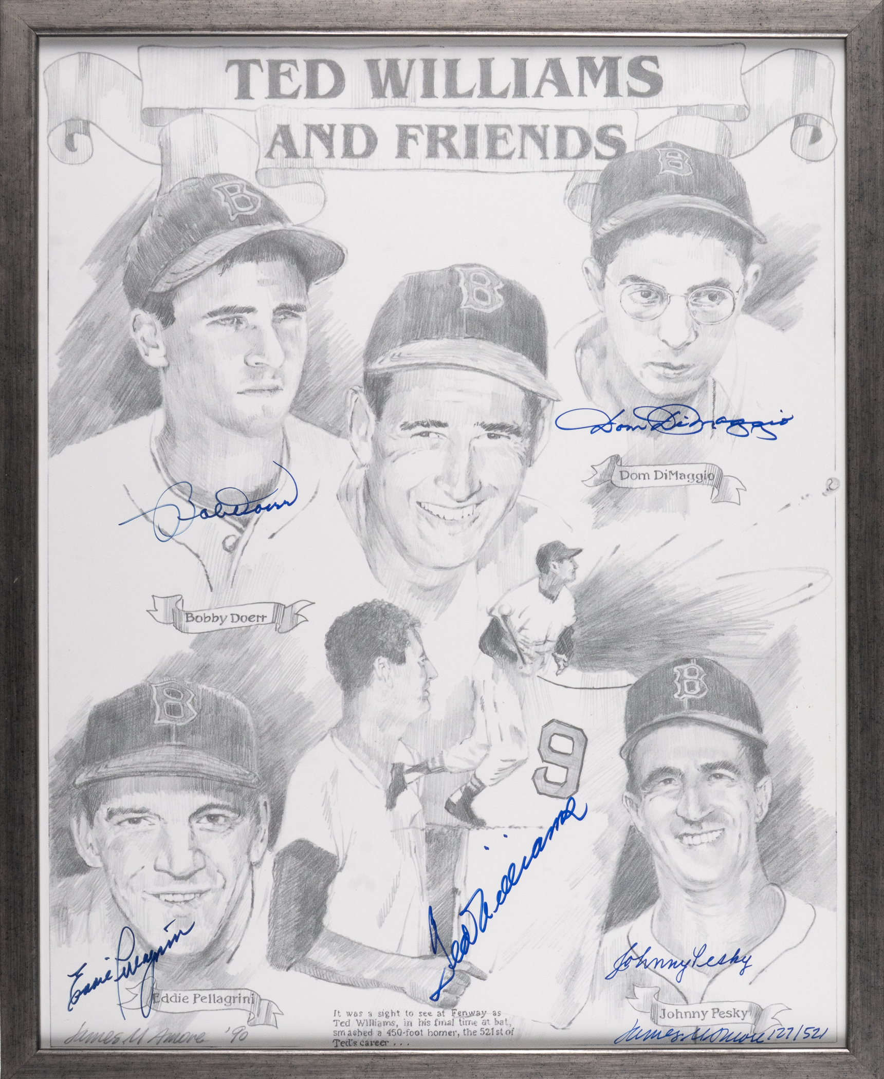 Recall a big year for supreme slugger Ted Williams and his closest Red Sox pals, with this multi-signed 1990 "Ted Williams and Friends" limited-edition lithograph print. The work of artist James Amore, this faithfully rendered piece showcases (5) stars from the 1946 Red Sox American League champions squad, with Williams (HOF), Dom DiMaggio, Johnny Pesky, Bobby Doerr (HOF), and Eddie Pellagrini. Each subject has provided a potent signature over his corresponding image by means of a blue felt-tip pen. Professionally framed to overall dimensions of 17-1/2" x 21-1/2", this handsome lithograph is also signed by artist Amore at bottom-right, with limited-edition numbering "127/521". Williams had an amazing year in 1946, earning the AL MVP award thanks to a .497 OPB. He also led the Sox to a magnificent 104-50 record, capturing the AL Pennant and making his only trip to the World Series.