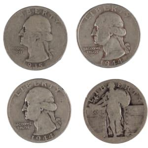Washington quarters (8): 1935 Ag, 1944 (X2) Vf, Fn, 1944-D Fn, 1946 Fn+, 1948 Vf, 1948-S Fn+, 1955 Xf.