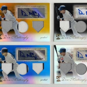 The New York Yankees hit machine known as "Donnie Baseball" shines with the offered 2009 Topps Tribute Autographed Triple Relics Don Mattingly near rainbow of (4/5) cards. Included the following parallels: #/25 gold, #/50 black, #/75 blue and #/99 base. Missing only #1/1 red parallel for rainbow completion.